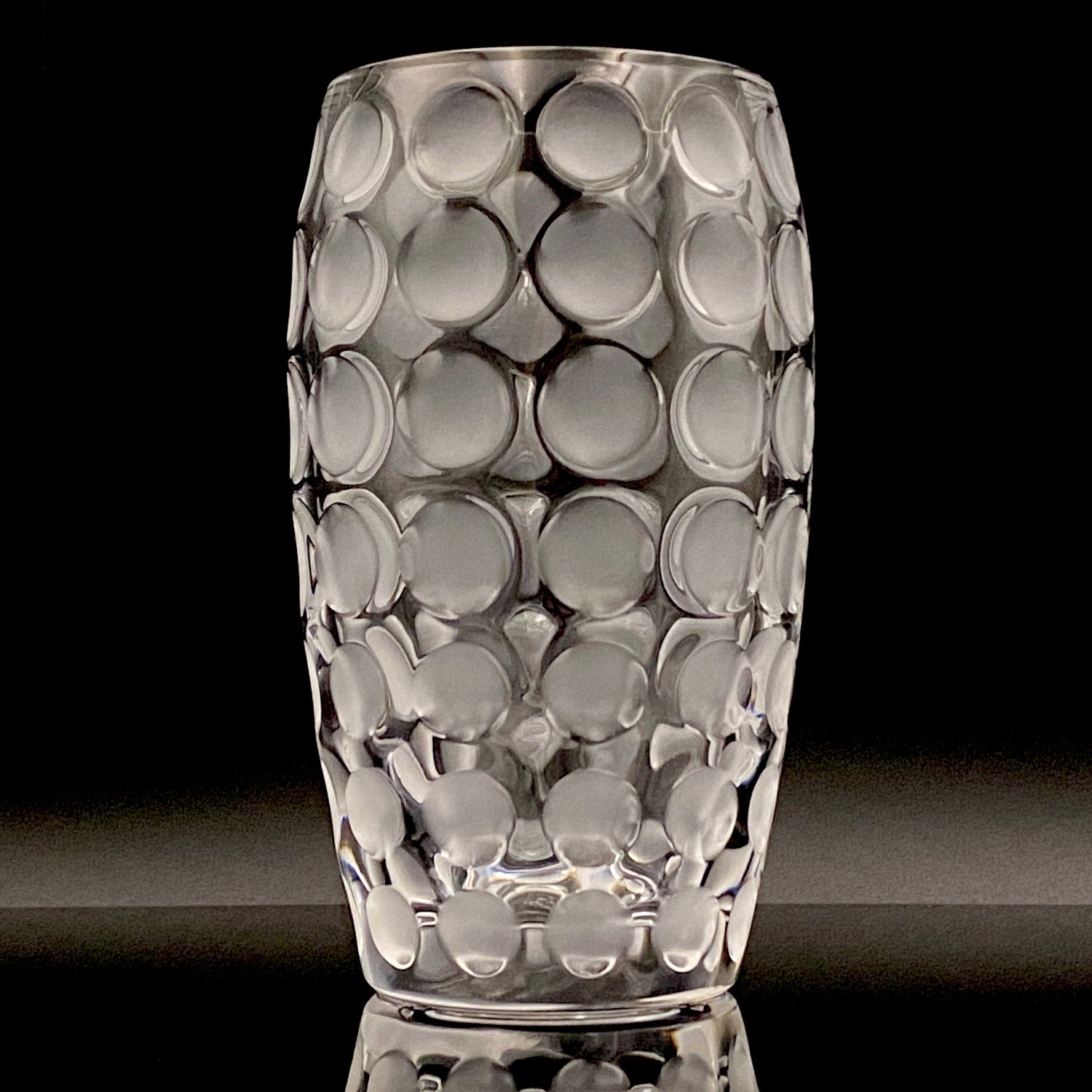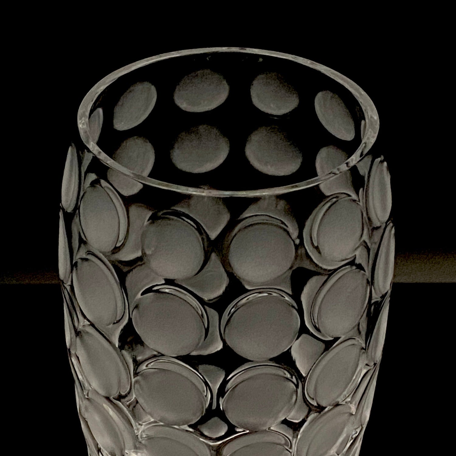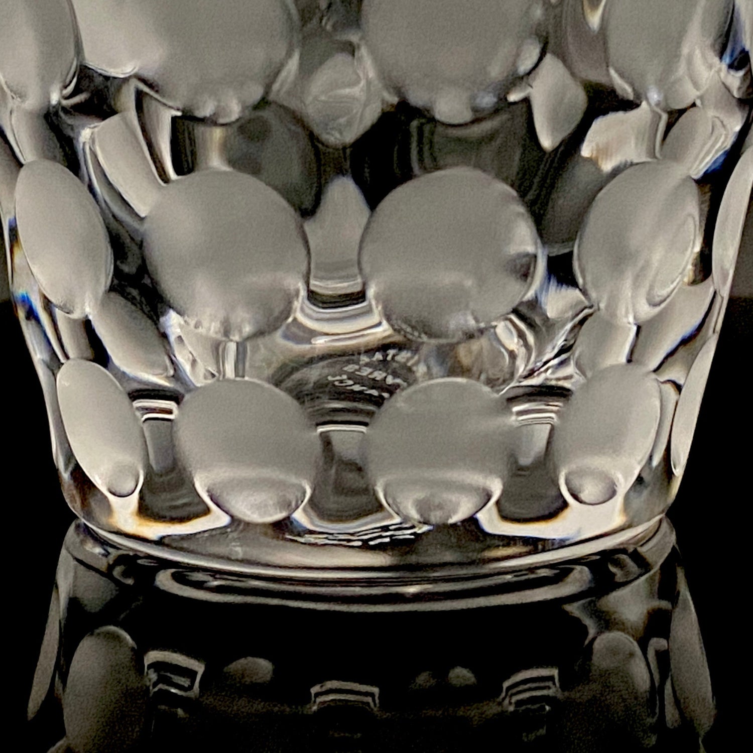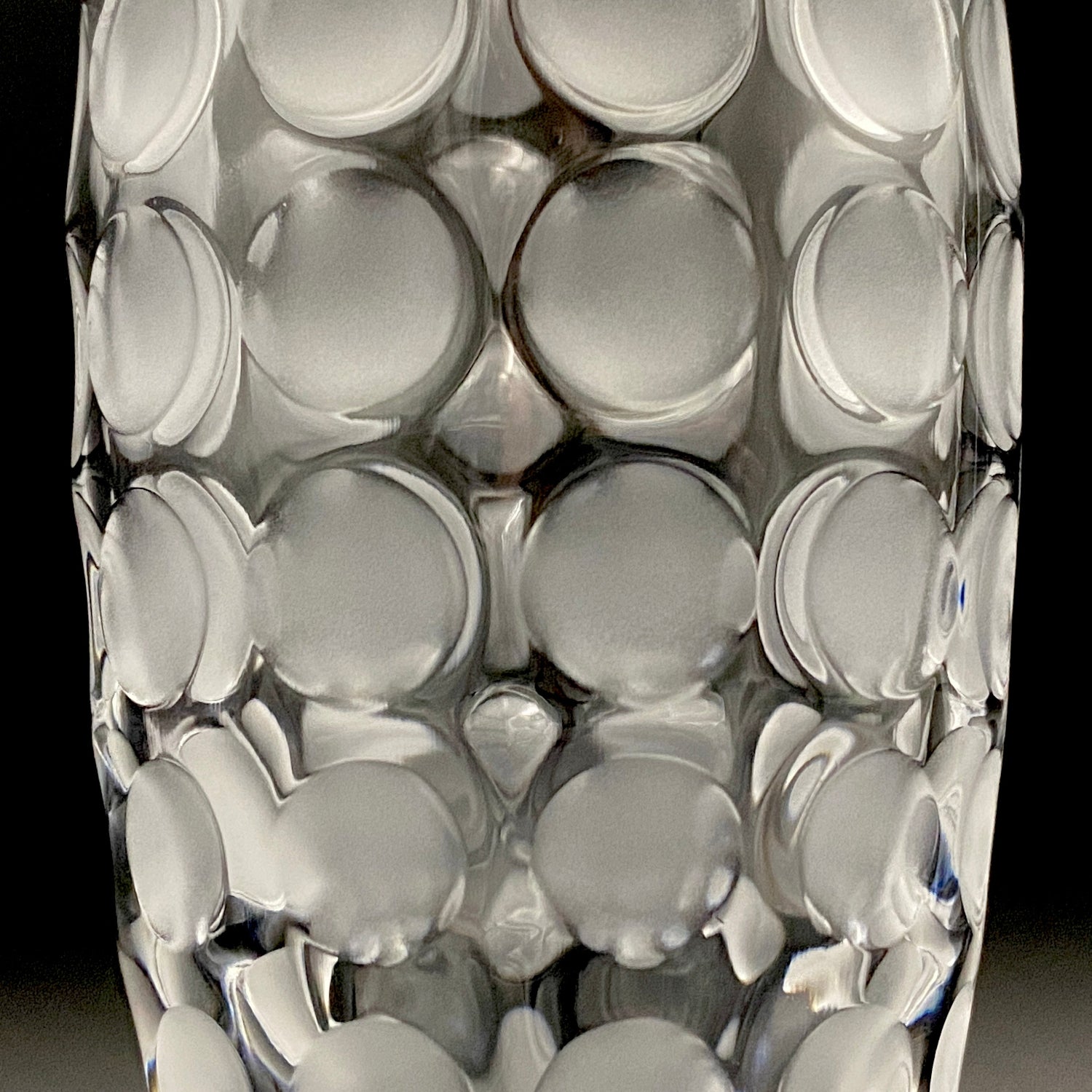 本品のデザインは、表面全体に均等に配された丸い凹凸と、その表面を柔らかなフロスト(すりガラス)加工で仕上げた、モダンな魅力を持つ逸品です。この加工法が、光を優しく拡散し、グラス全体に幻想的で涼しげな質感を与えています。台座には『CRISTAL SÈVRES FRANCE』の刻印が確認でき、その品質と歴史を保証しています。この幾何学的でモダンなデザインと、刻印の形式から、本作品はセーブルが伝統的な技術を踏襲しつつ、モダンデザインを積極的に取り入れていた1960年代後半から1970年代にかけて制作されたと推測されます。