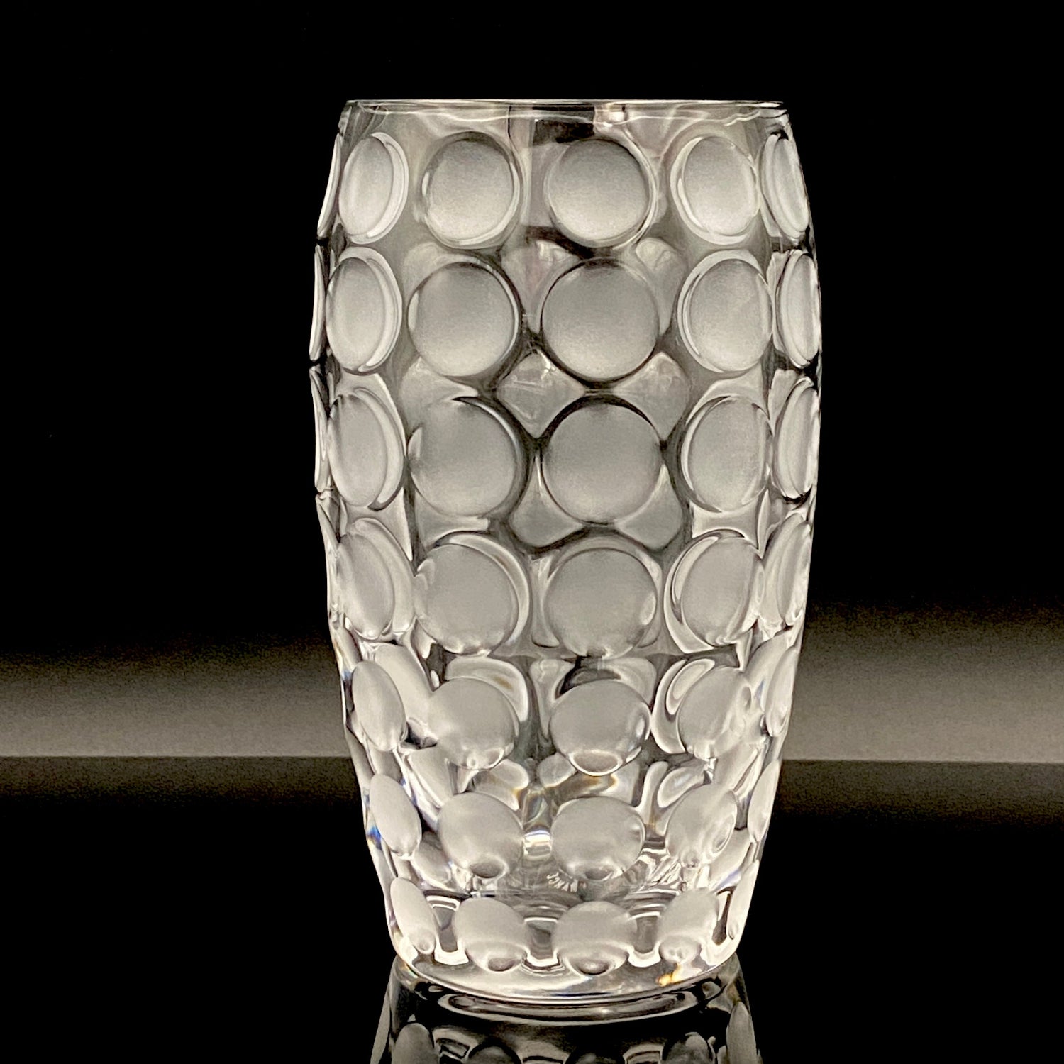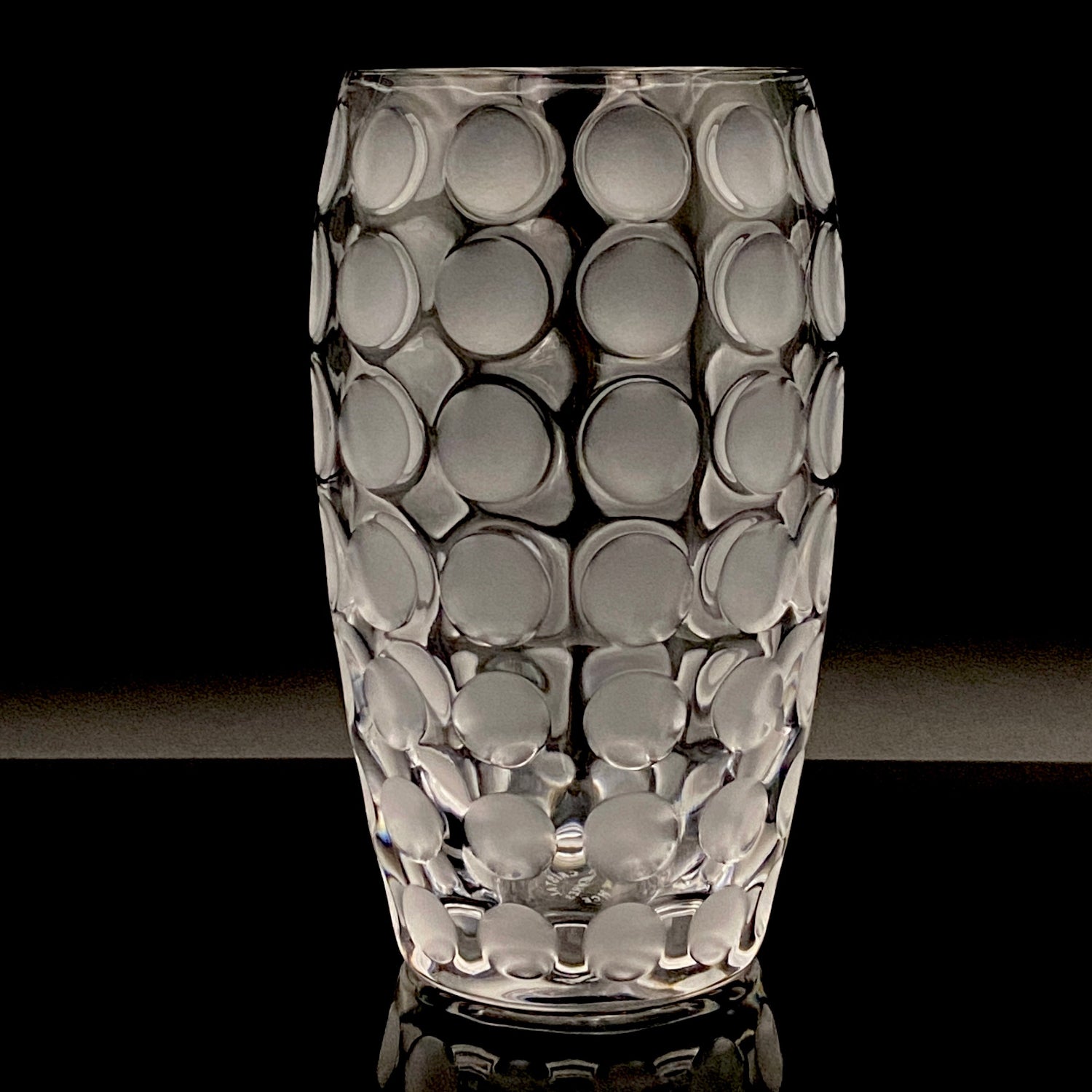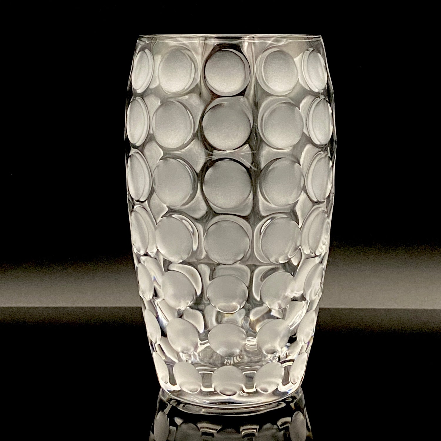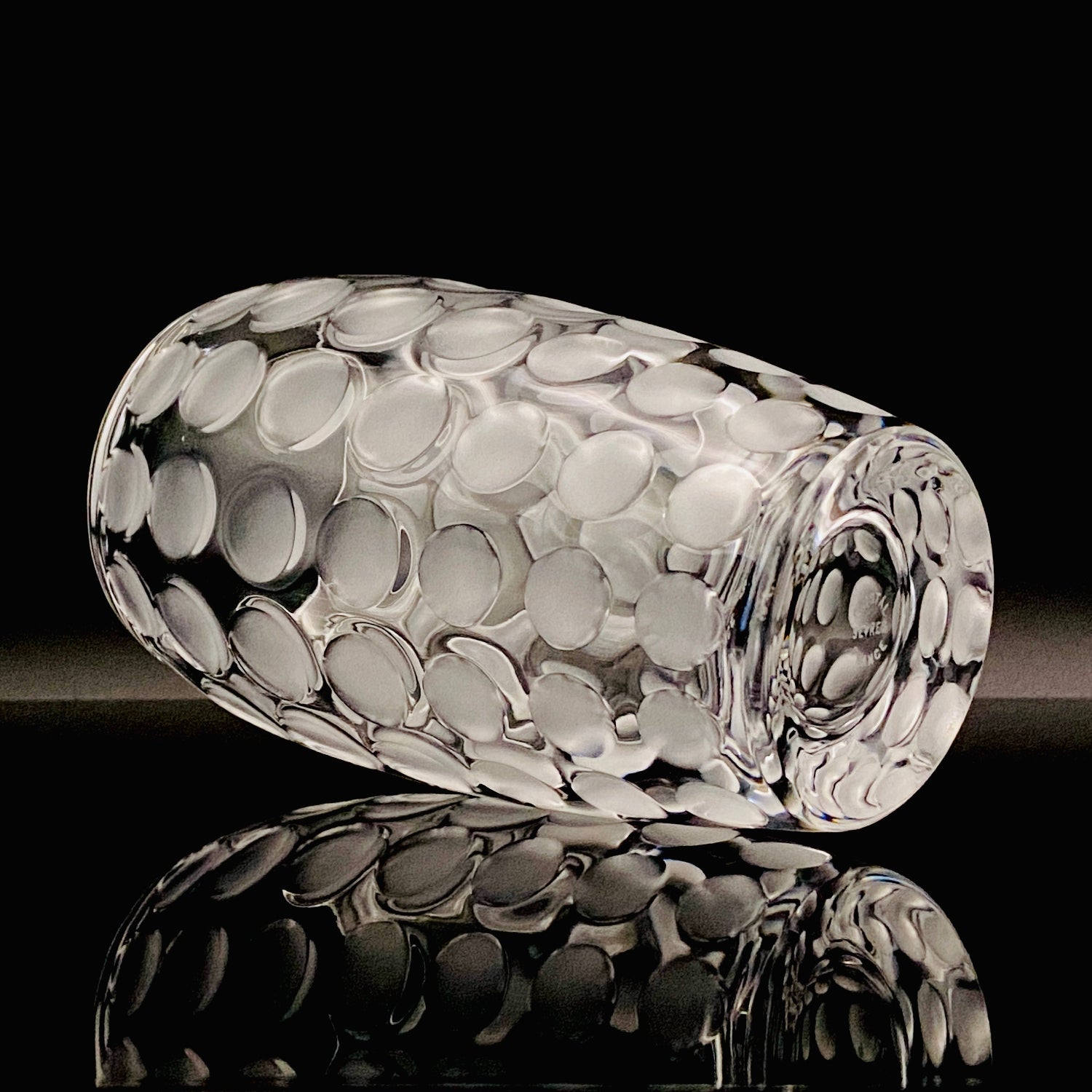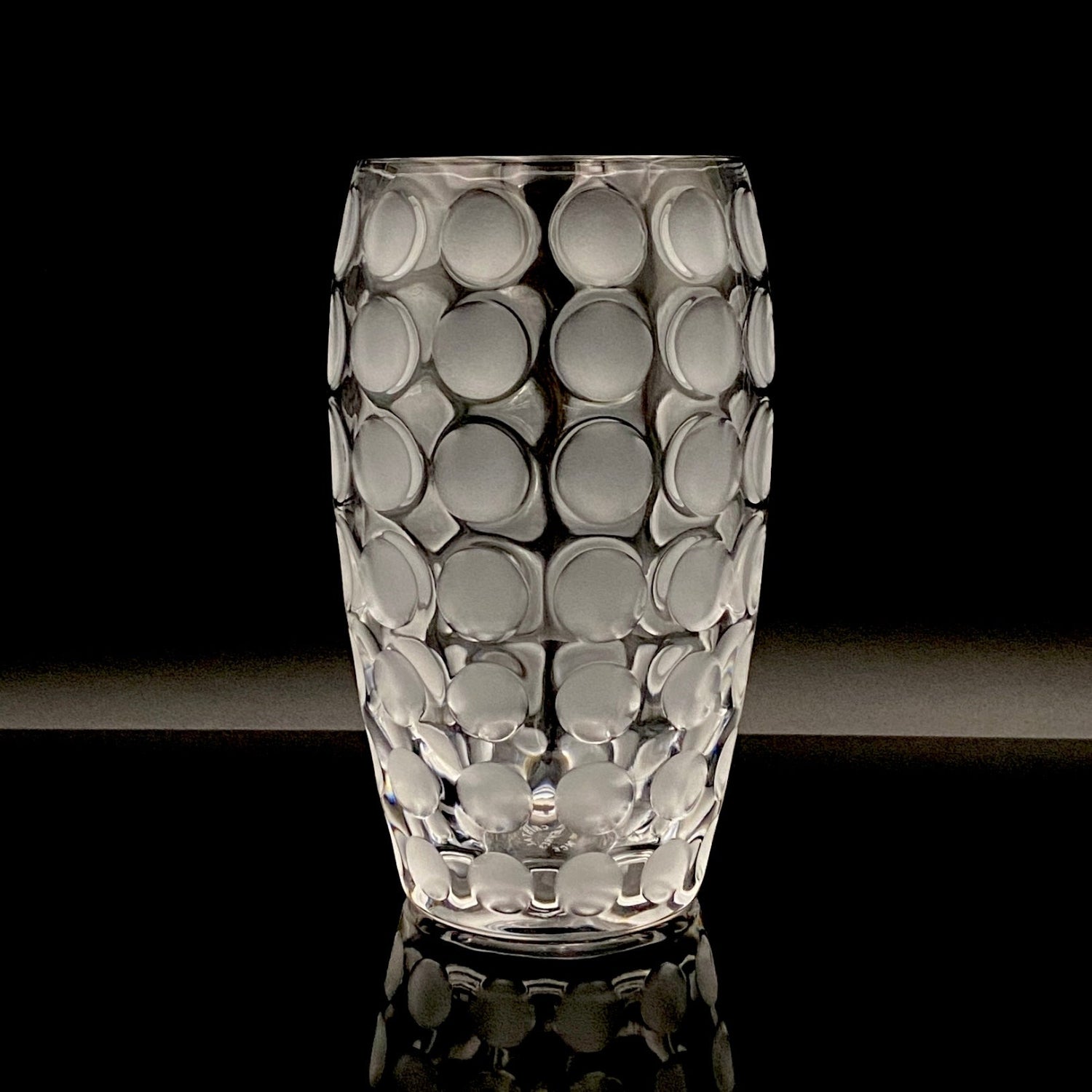 本品のデザインは、表面全体に均等に配された丸い凹凸と、その表面を柔らかなフロスト(すりガラス)加工で仕上げた、モダンな魅力を持つ逸品です。この加工法が、光を優しく拡散し、グラス全体に幻想的で涼しげな質感を与えています。台座には『CRISTAL SÈVRES FRANCE』の刻印が確認でき、その品質と歴史を保証しています。この幾何学的でモダンなデザインと、刻印の形式から、本作品はセーブルが伝統的な技術を踏襲しつつ、モダンデザインを積極的に取り入れていた1960年代後半から1970年代にかけて制作されたと推測されます。