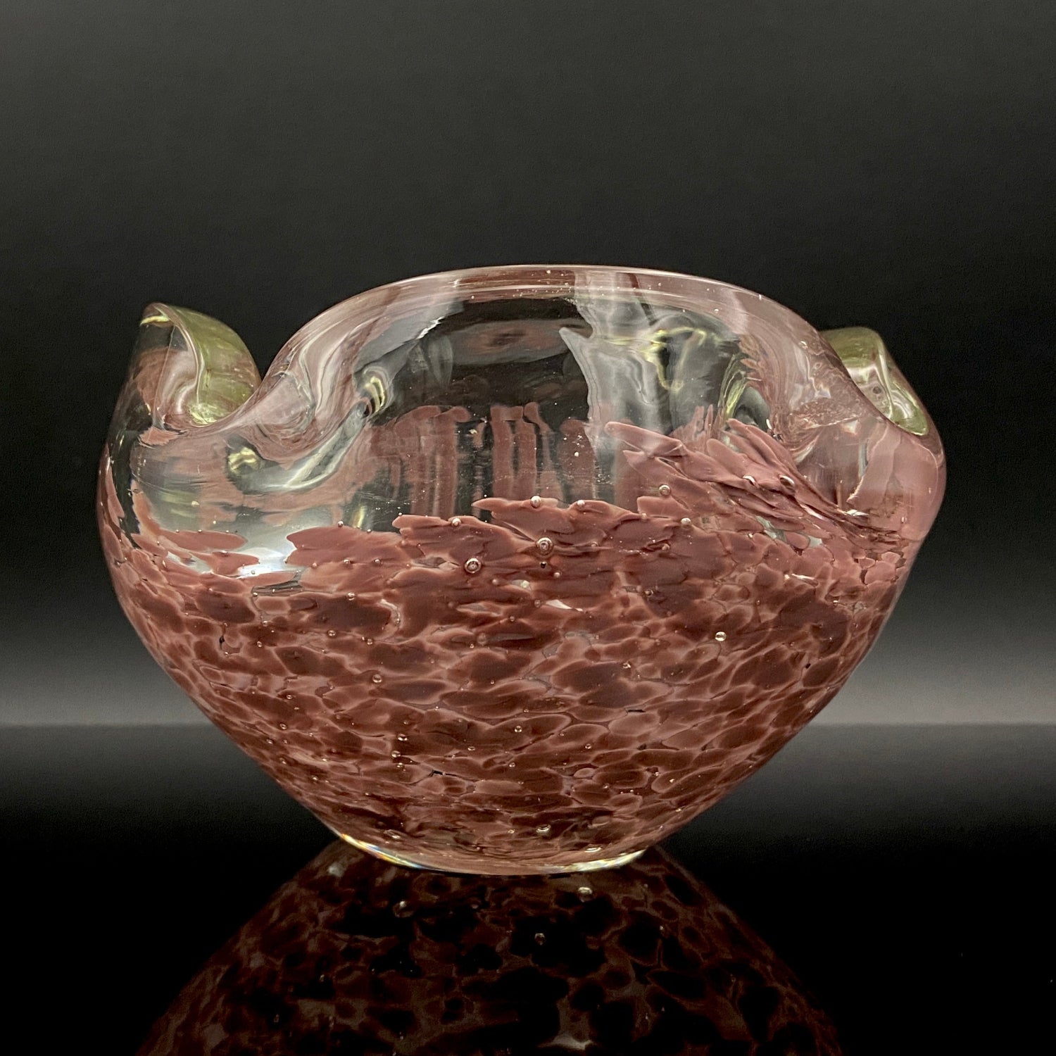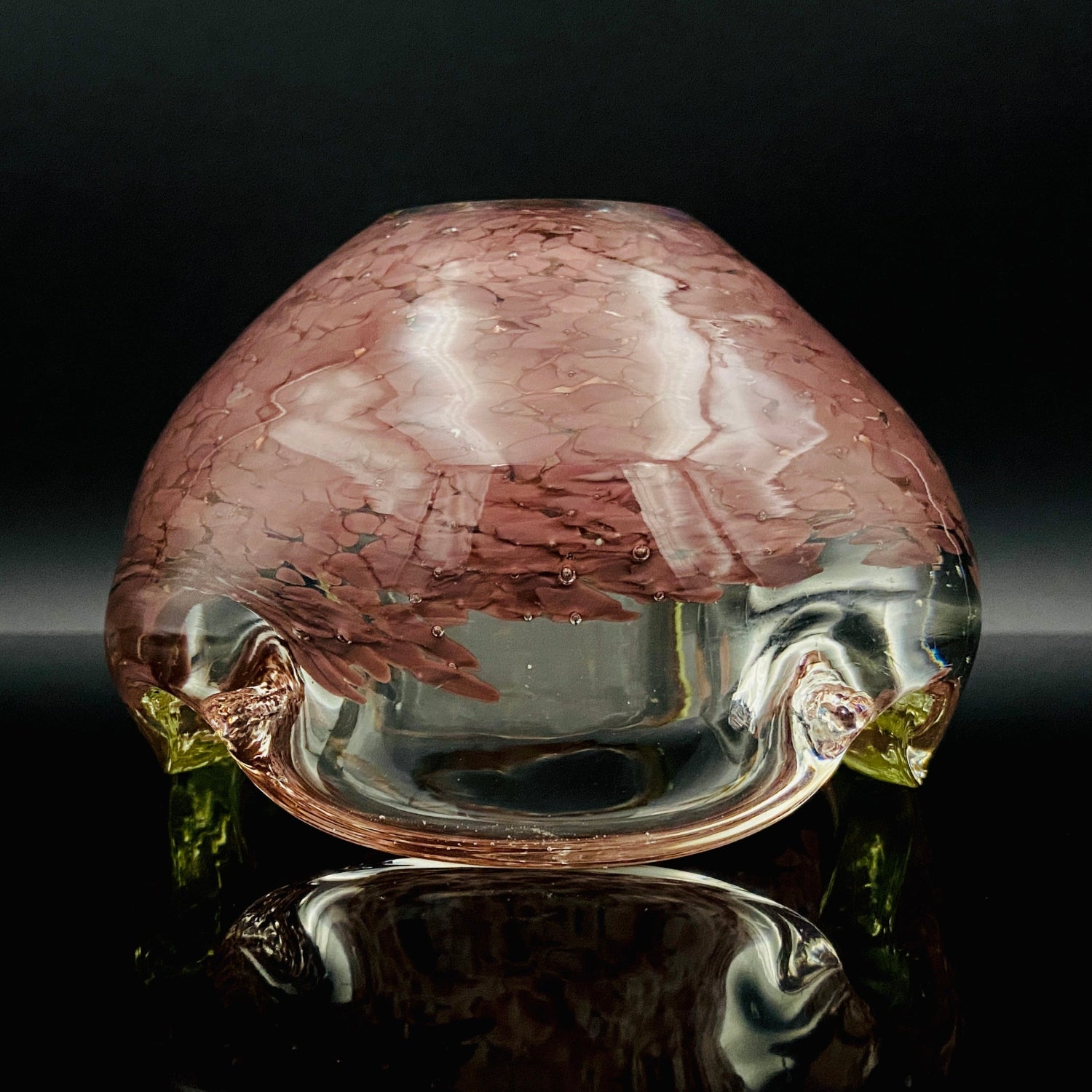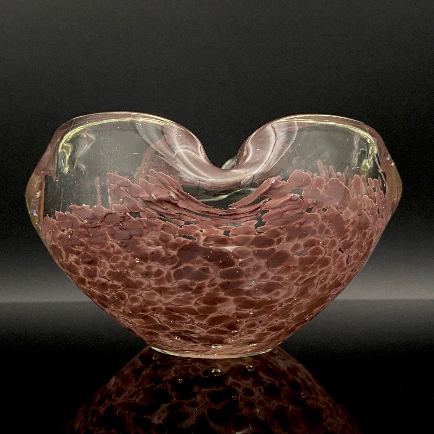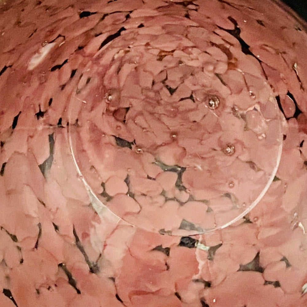 この作品の最大の特徴は、ガラスの底から上部へと複雑に溶け込む深みのある紫(マルーンまたはパープル・レッド)の斑文(ふもん)です。この斑文は、透明なガラスの層に包まれながら、無数の小さな気泡と共にまるで生きているかのように拡散しており、光を透過すると、見る角度によって日本の春を彩る桜の花びらが群れ集うような幻想的な情景を映し出します。
