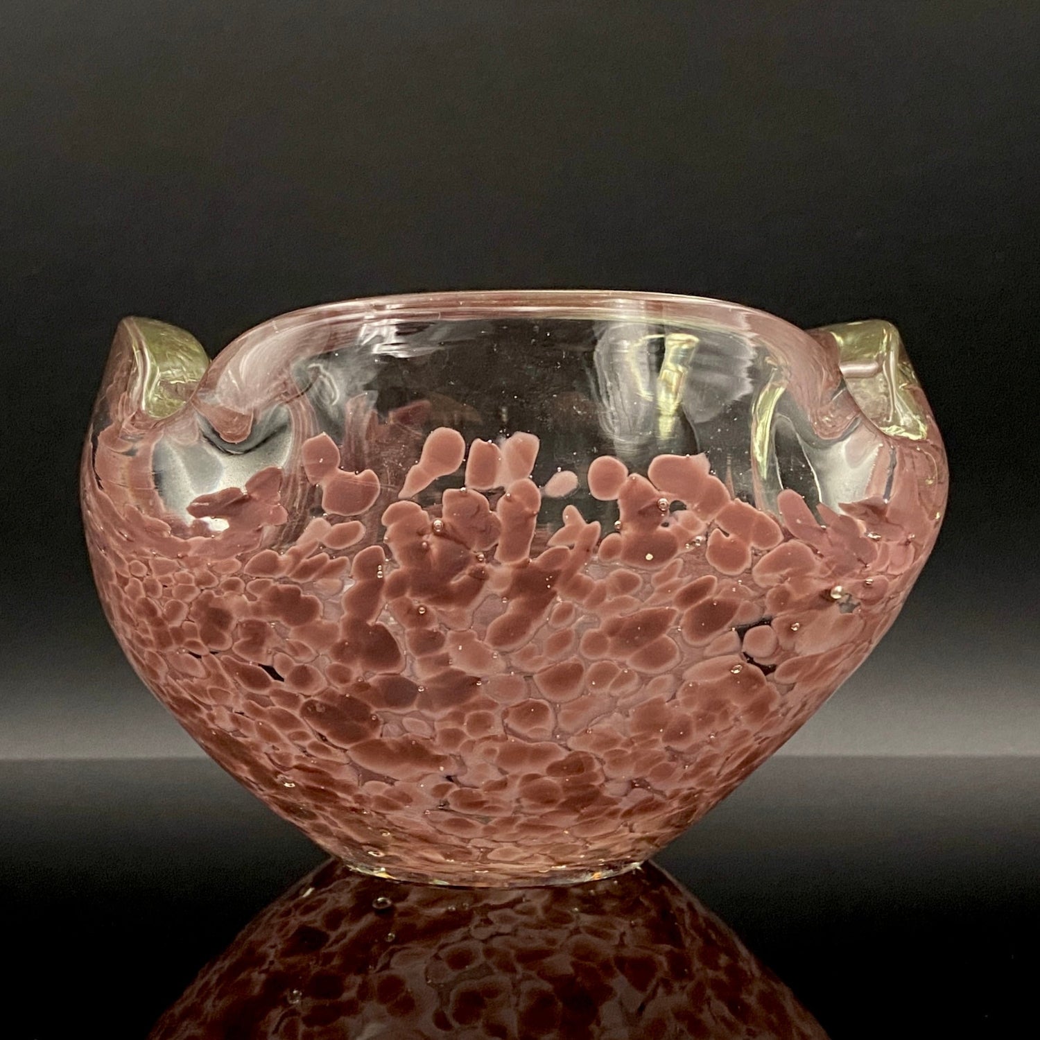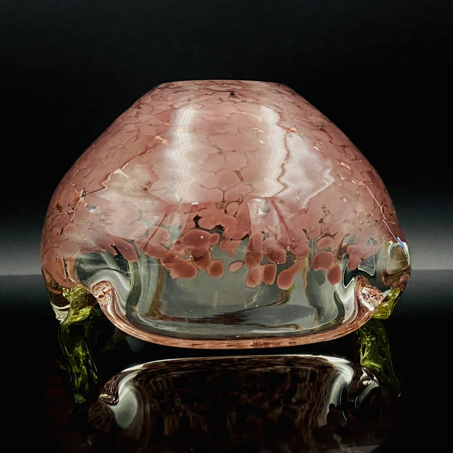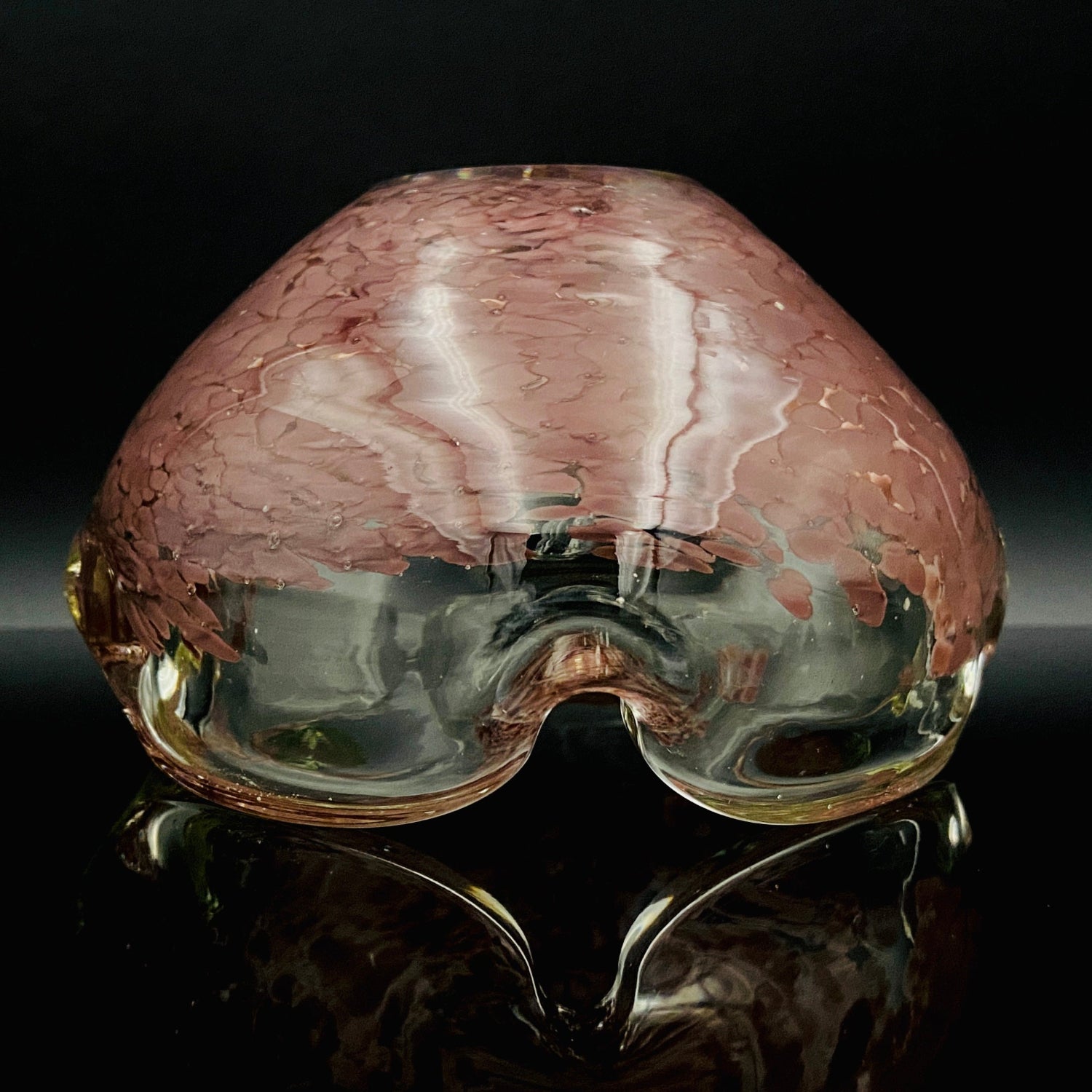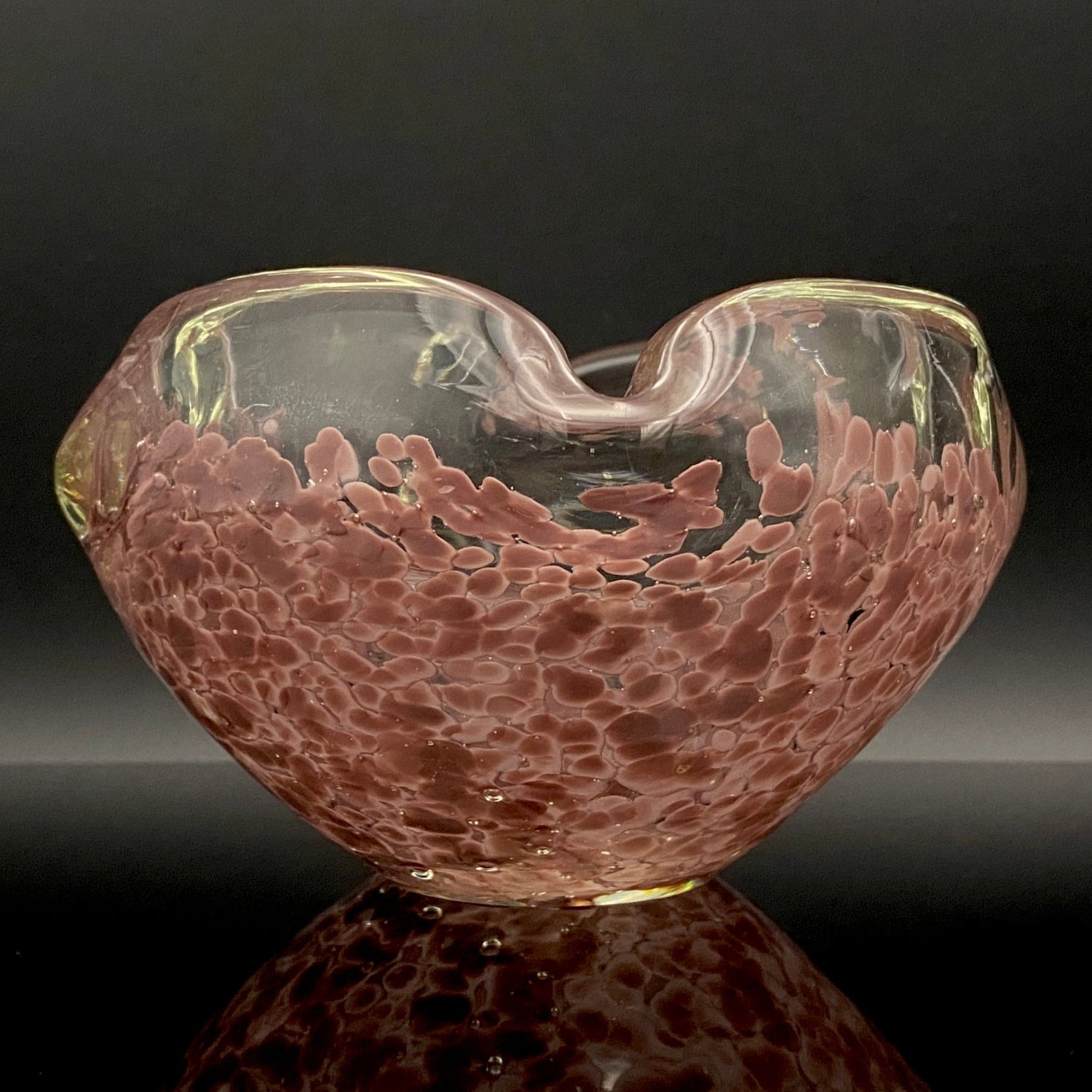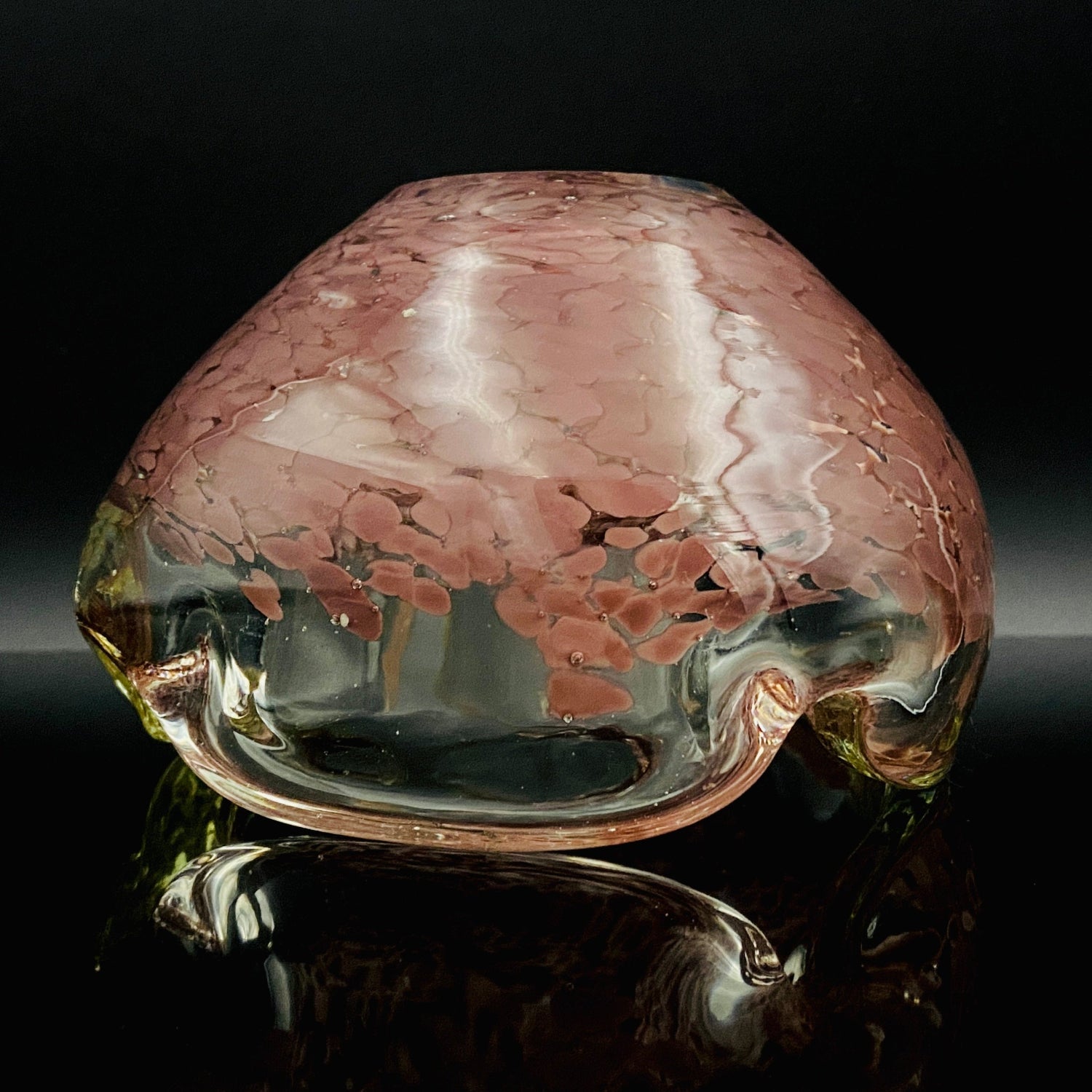この作品の最大の特徴は、ガラスの底から上部へと複雑に溶け込む深みのある紫(マルーンまたはパープル・レッド)の斑文(ふもん)です。この斑文は、透明なガラスの層に包まれながら、無数の小さな気泡と共にまるで生きているかのように拡散しており、光を透過すると、見る角度によって日本の春を彩る桜の花びらが群れ集うような幻想的な情景を映し出します。