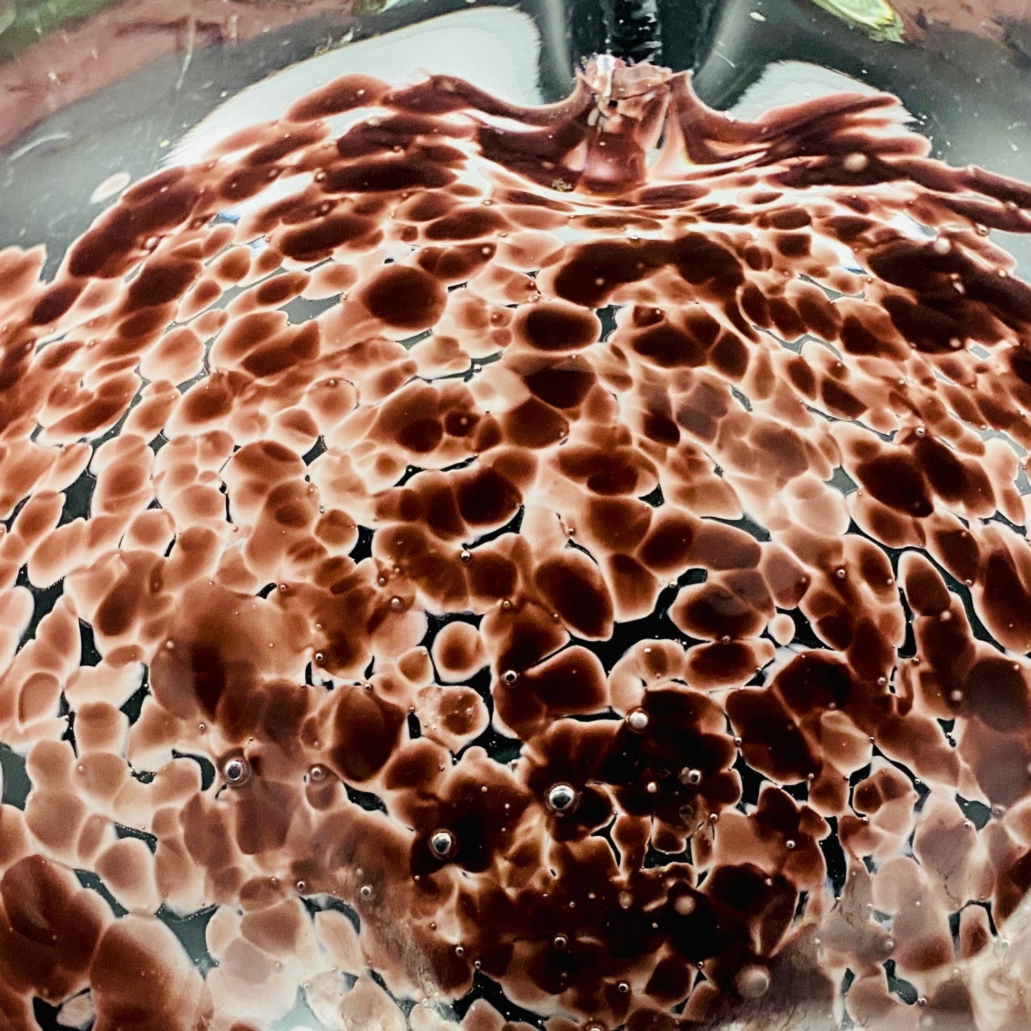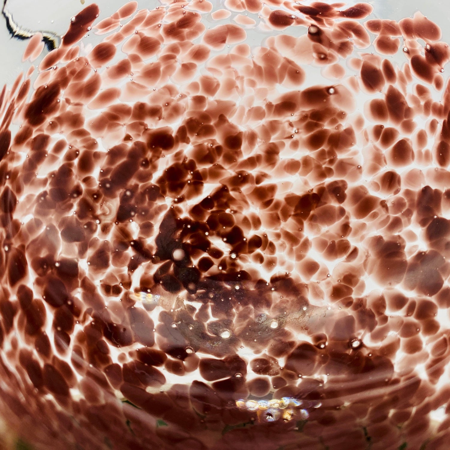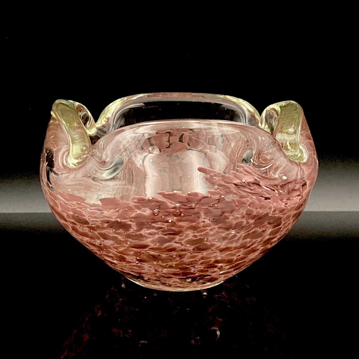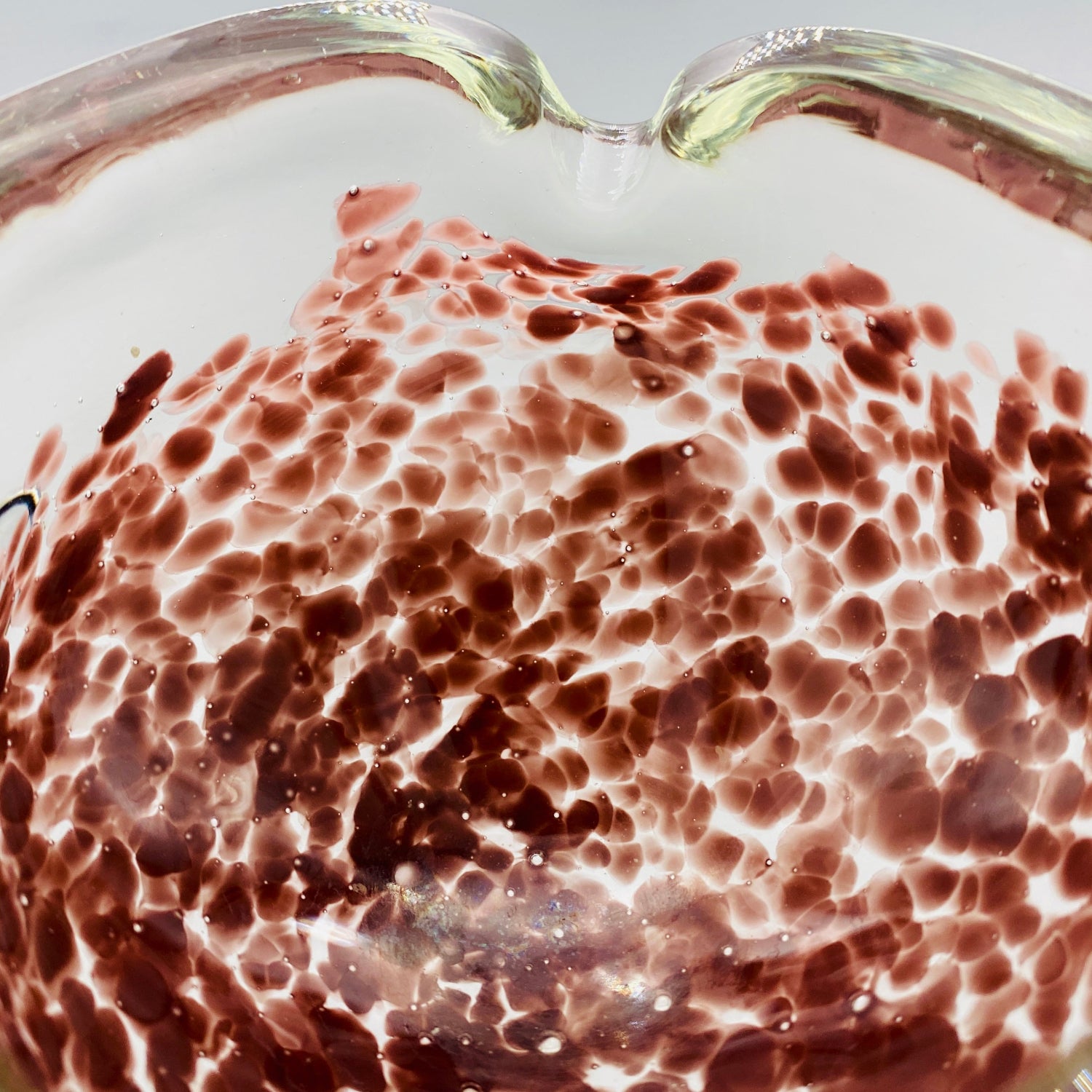 この作品の最大の特徴は、ガラスの底から上部へと複雑に溶け込む深みのある紫(マルーンまたはパープル・レッド)の斑文(ふもん)です。この斑文は、透明なガラスの層に包まれながら、無数の小さな気泡と共にまるで生きているかのように拡散しており、光を透過すると、見る角度によって日本の春を彩る桜の花びらが群れ集うような幻想的な情景を映し出します。