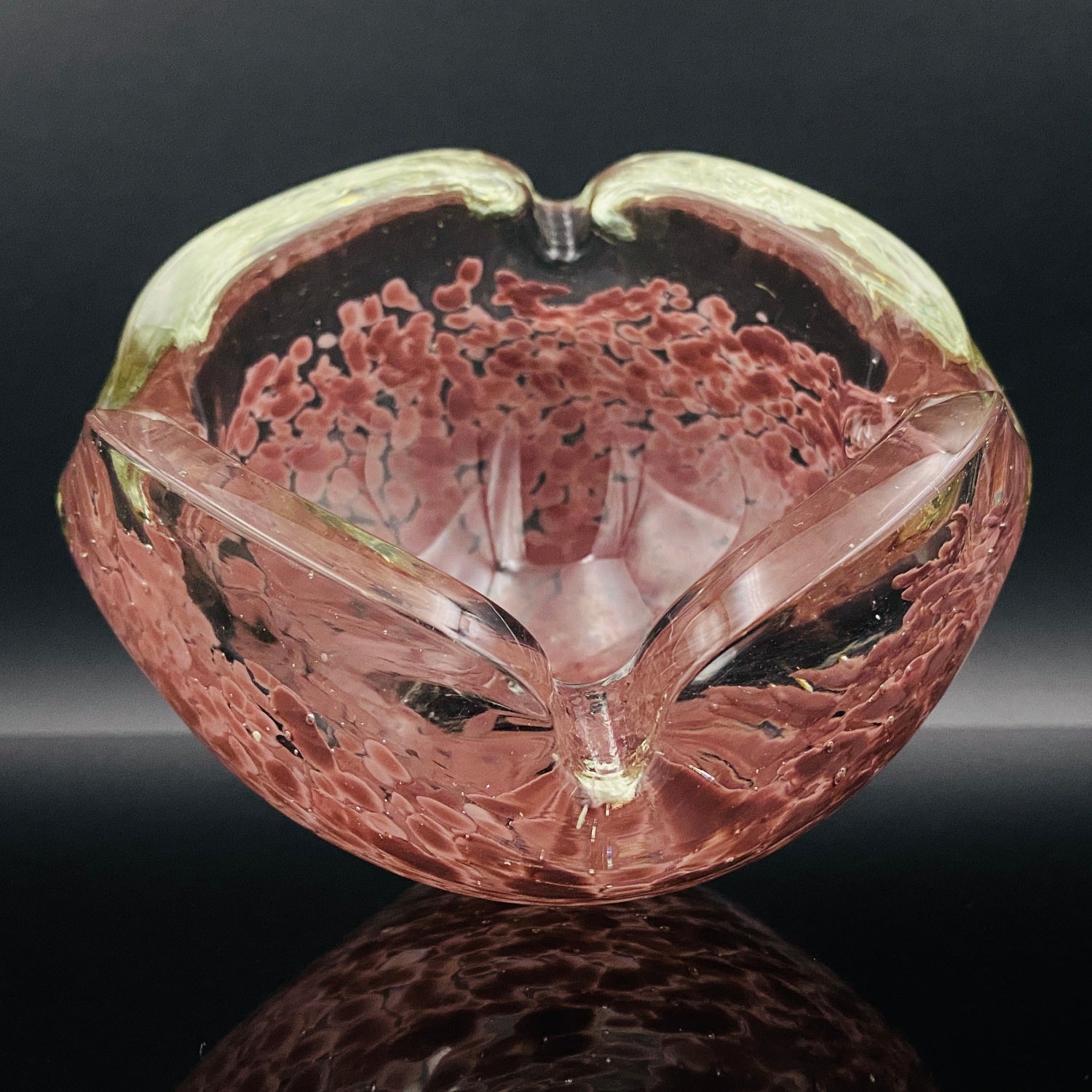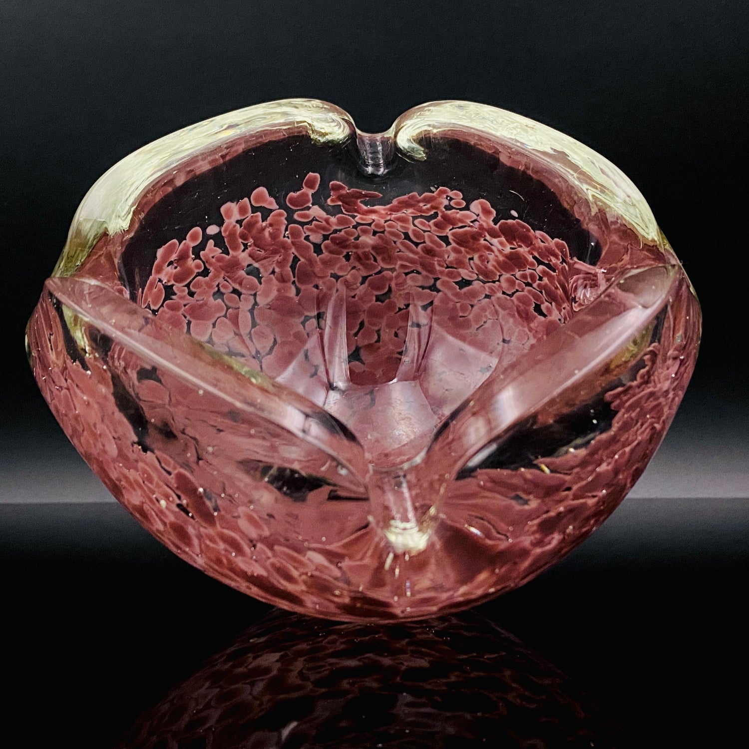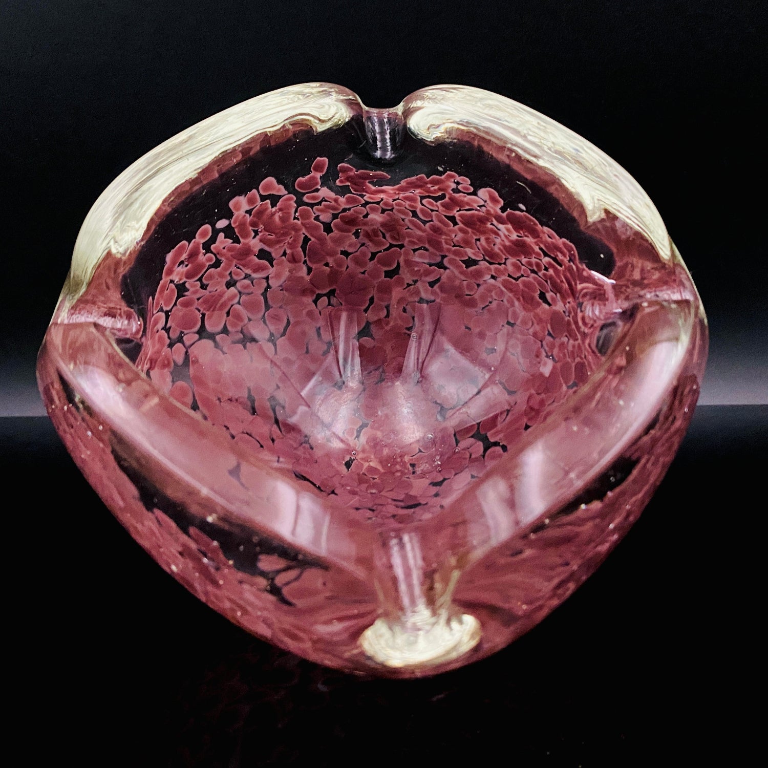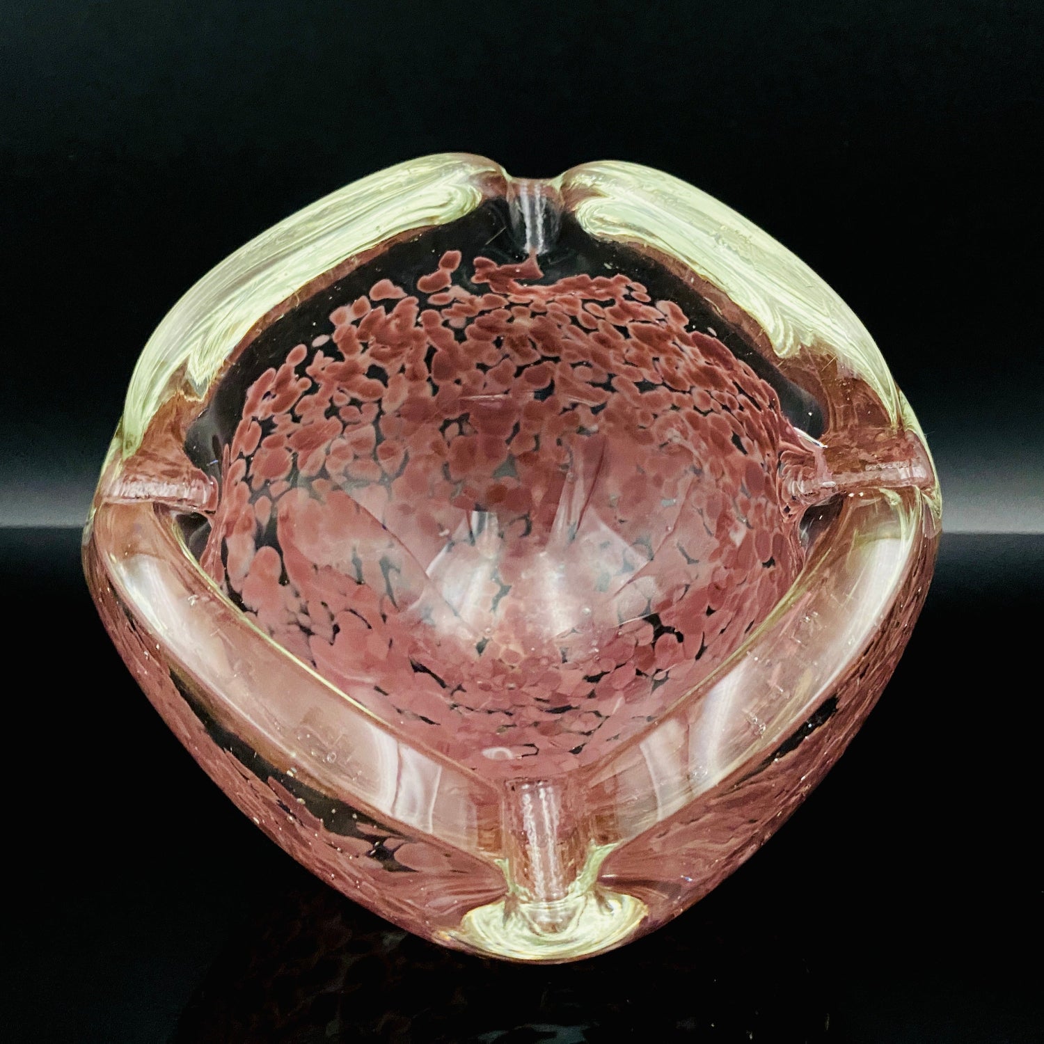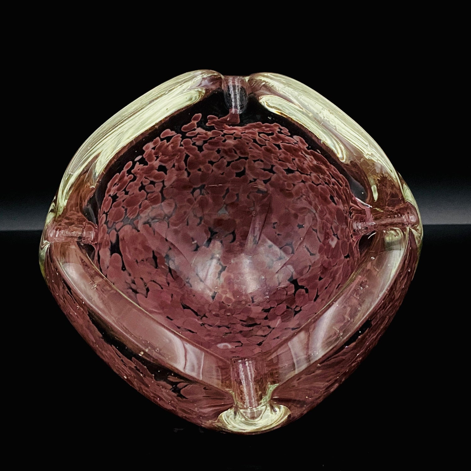 造形は、正方形に近い形状をしていますが、各角が上に向かって大きく反り返るようにデザインされており、灰皿としてだけでなく、アール・デコやミッドセンチュリーのオブジェとして通用する芸術性の高いフォルムをしています。手に取ると、ガラスが持つ本来の重厚さが伝わり、どっしりとした安定感があります。