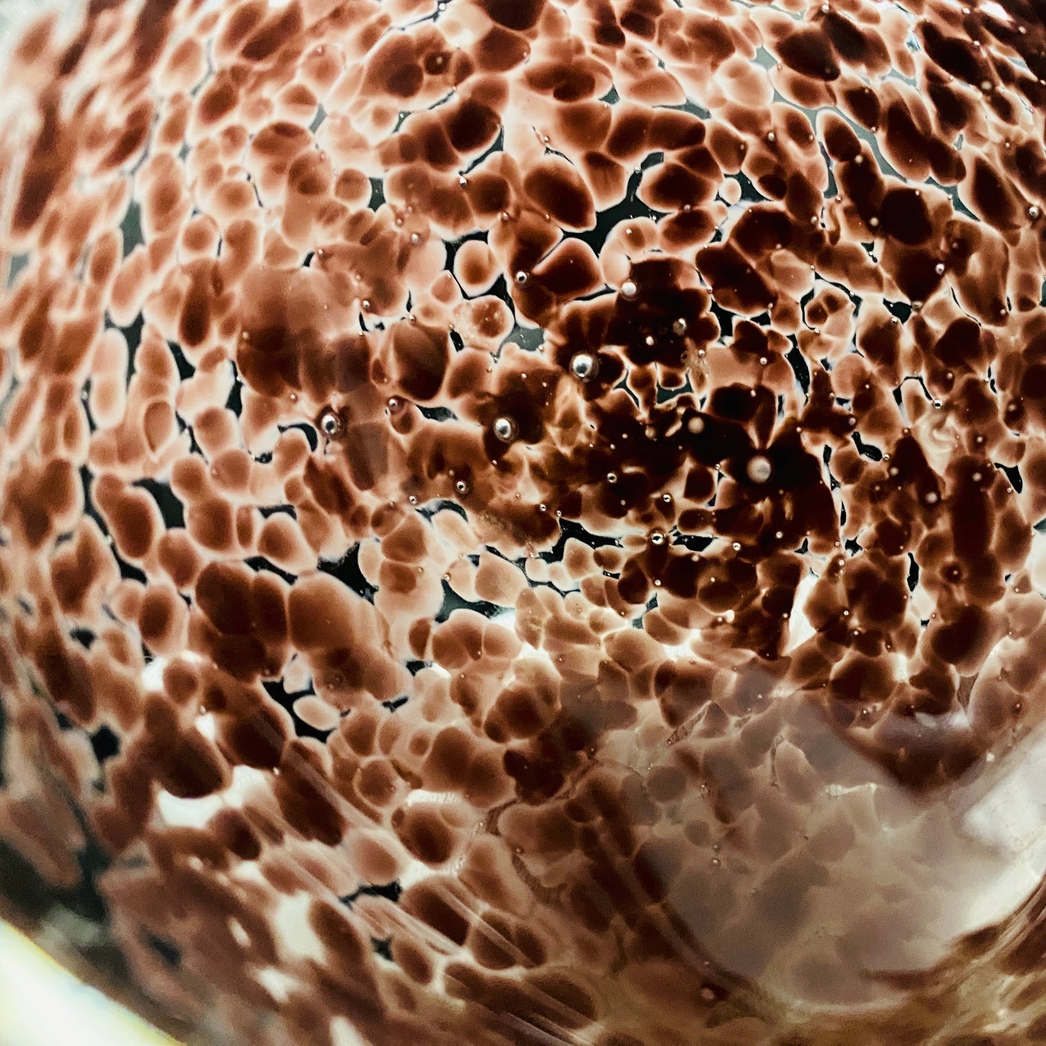 この作品に使用されている複雑な色ガラスは、光の条件によってその色調が大きく変化します。光の強さや角度、また写真を表示するモニターの種類によっては、色彩が赤みがかった紫、深い茶色、または温かいピンク系に見える場合がございます。その唯一無二の色彩の移ろいを、どうぞお楽しみください。