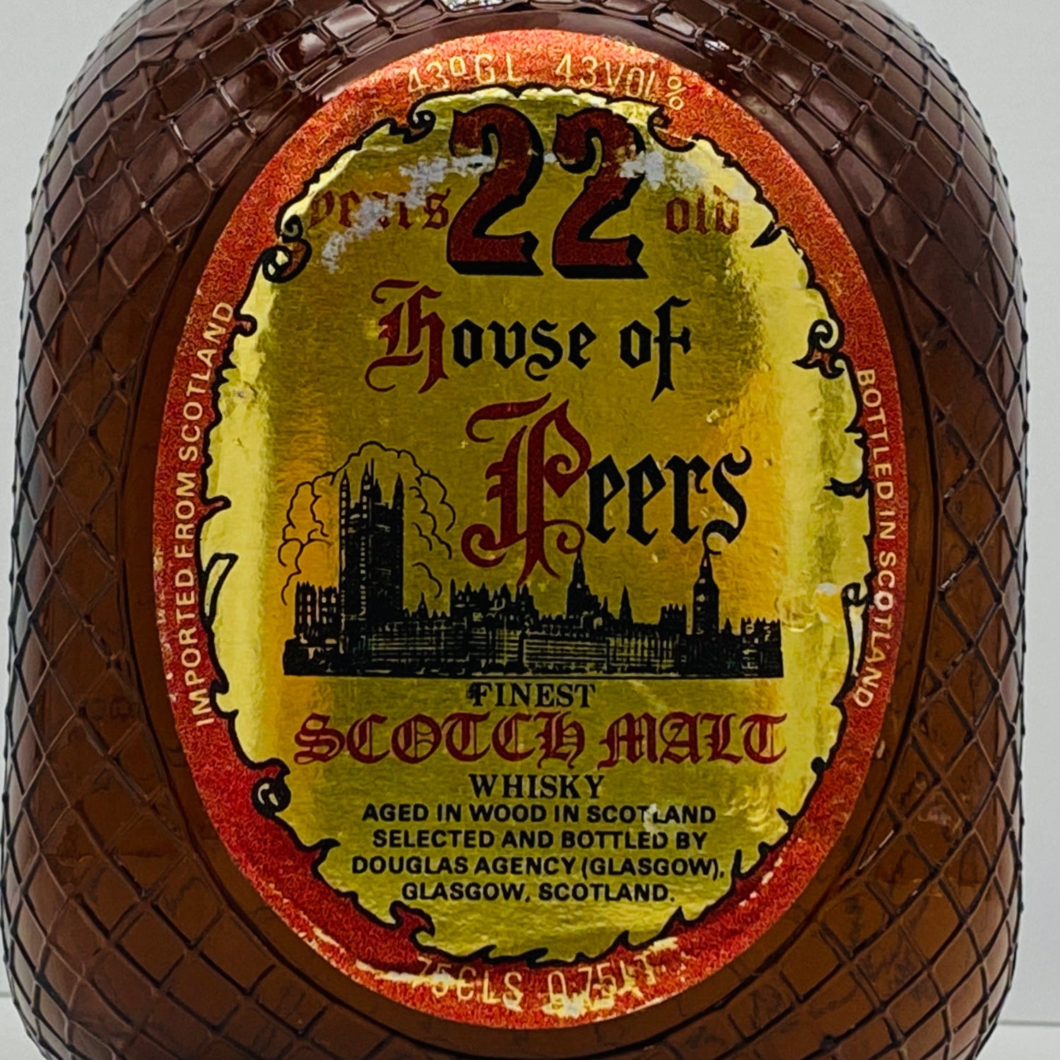 このボトルは、イギリス上院(貴族院)に由来する「ハウスオブピアーズ」の銘を冠した、『22年熟成のスコッチモルトウイスキー』です。ボトラーズであるダグラス・レイン社(当時)が手掛け、1980年代に流通した極めて珍しいのオールドボトルとして知られています。