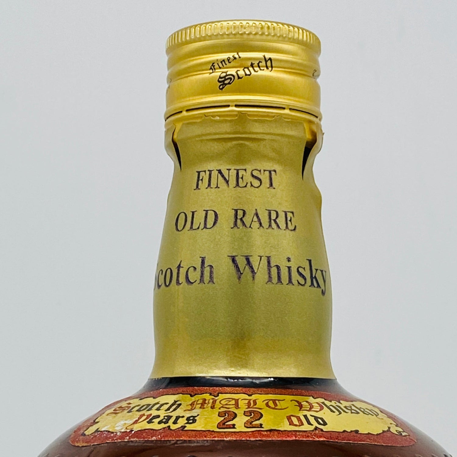 ラベルは鮮やかなゴールドと深紅の配色で、中央にはイギリスの国会議事堂のようなシルエットが描かれ、銘柄の由来となった貴族的なイメージを強調しています。このボトルは、容量750ml、アルコール度数43%という、当時の国際市場で流通していたプレミアムウイスキーの標準的な仕様です。キャップは簡素なスクリューキャップですが、ネックラベルにはウイスキーの熟成年数を示す「AGED 22 years」が誇らしげに記されています。