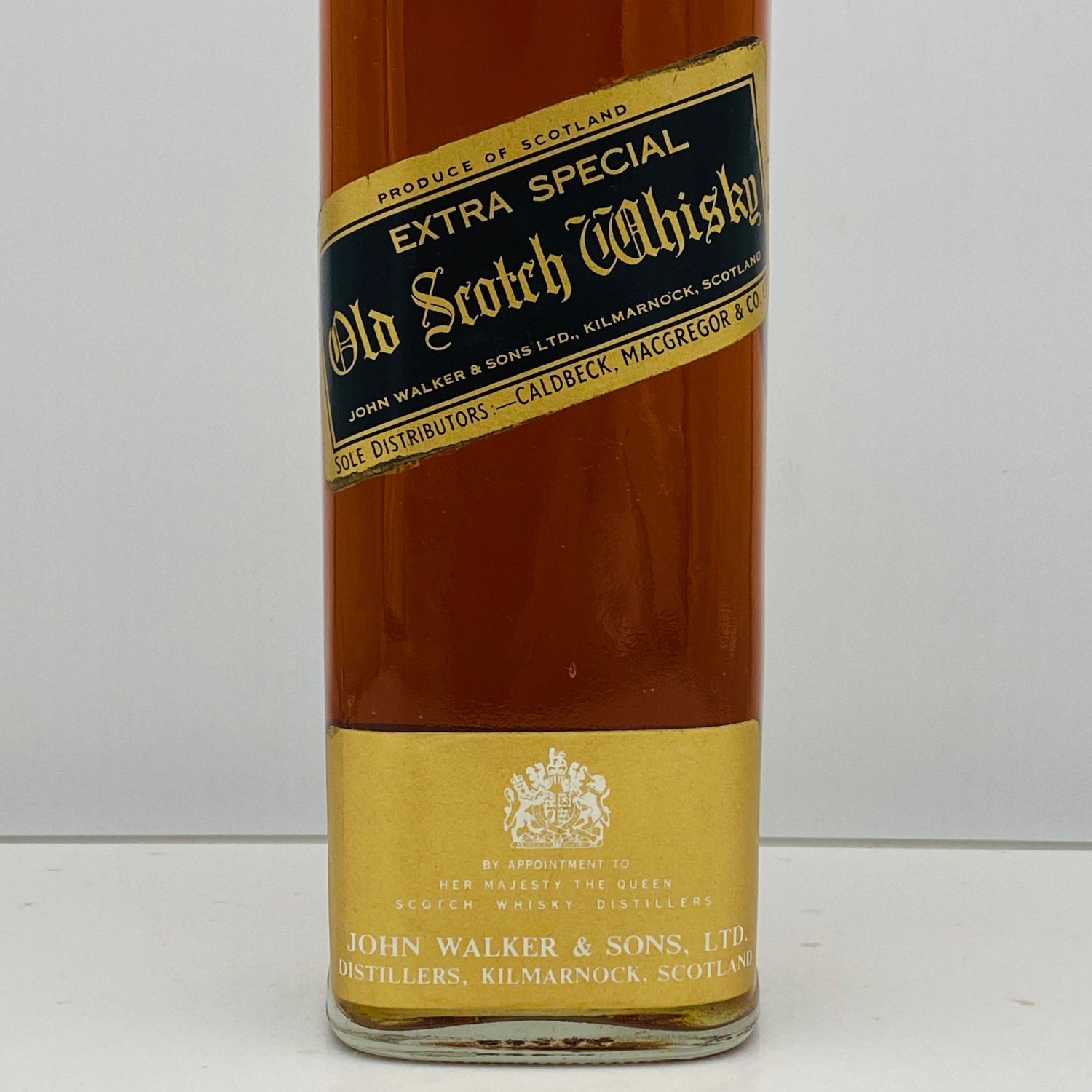 ボトルは、ジョニーウォーカー伝統の四角い角瓶(スクエアボトル)の形状を保ち、特級表示の金色のネックラベルが貼られています。容量は760ml、アルコール度数は43度であり、旧酒税法下の規格でボトリングされていました。メインラベルは斜めに貼られたブラックラベルの意匠であり、中央に「EXTRA SPECIAL Old Scotch Whisky」と記されています。裏面の日本語ラベルから、輸入業者が三菱商事株式会社であり、東京都千代田区丸の内を拠点としていたことが確認できます。