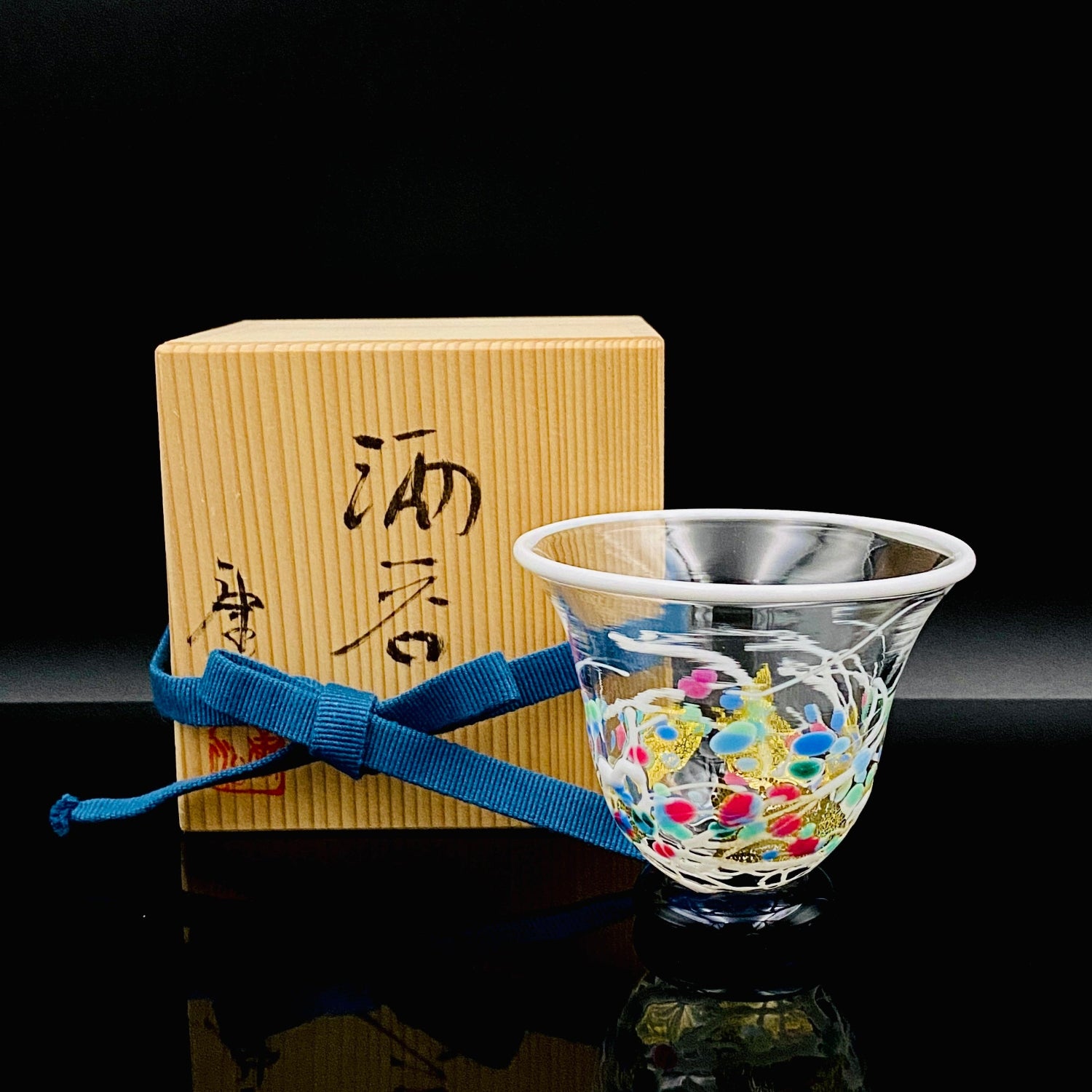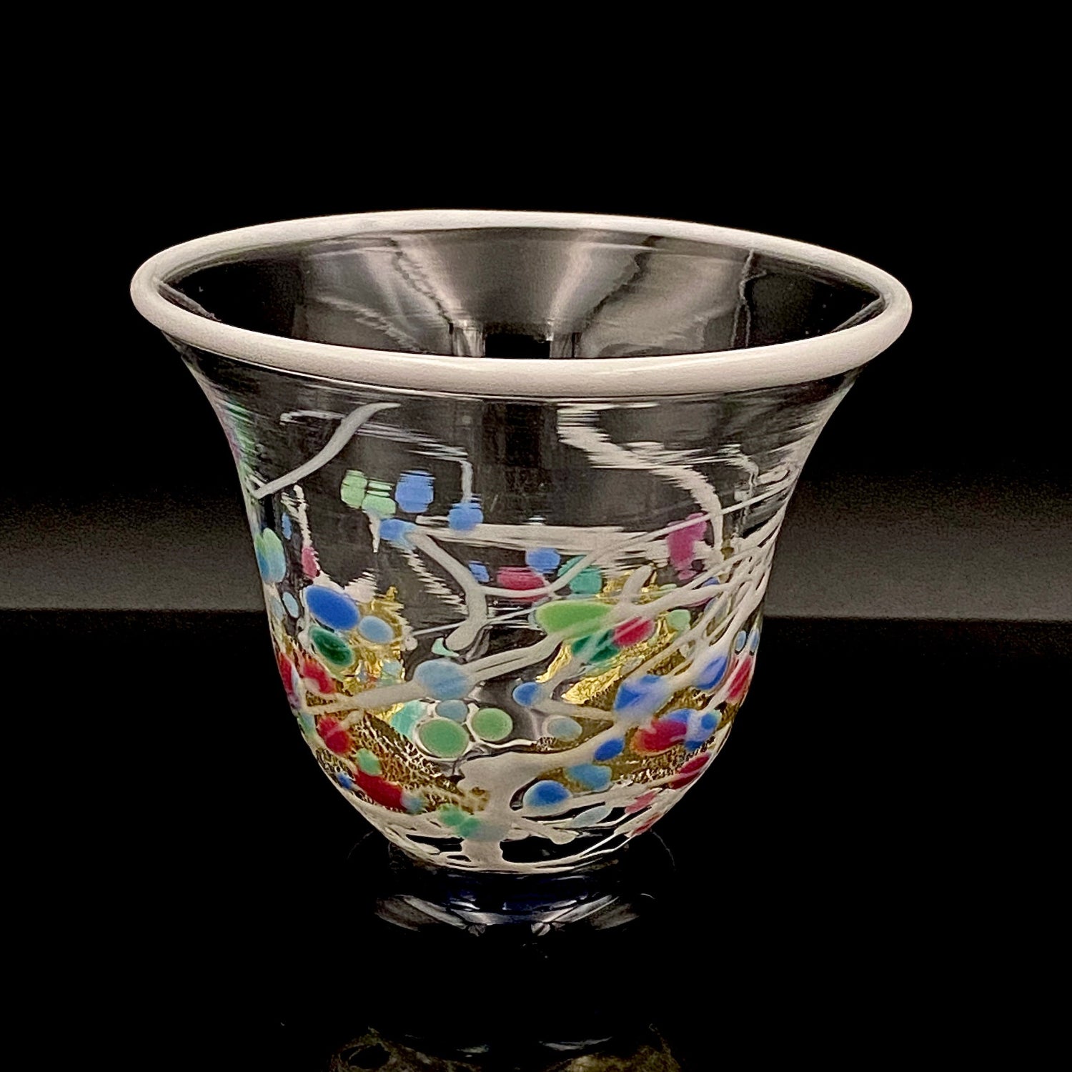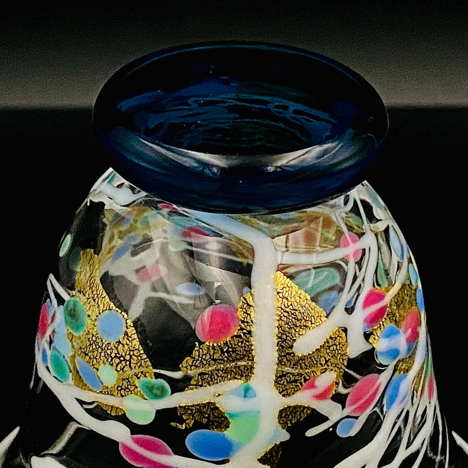 作品はすべて手作業による一点物であり、グラスの形状、底部の重厚な作り、そして口縁に施された白い巻き込みの丁寧な仕上げから、作家の高度な技術と芸術性が感じられます。日本の伝統的な工芸美と現代的な感性が融合した、高い美術的価値を持つ逸品であり、付属の共箱と作家の署名入りの栞は、この作品が正規の作品であることを保証しています。