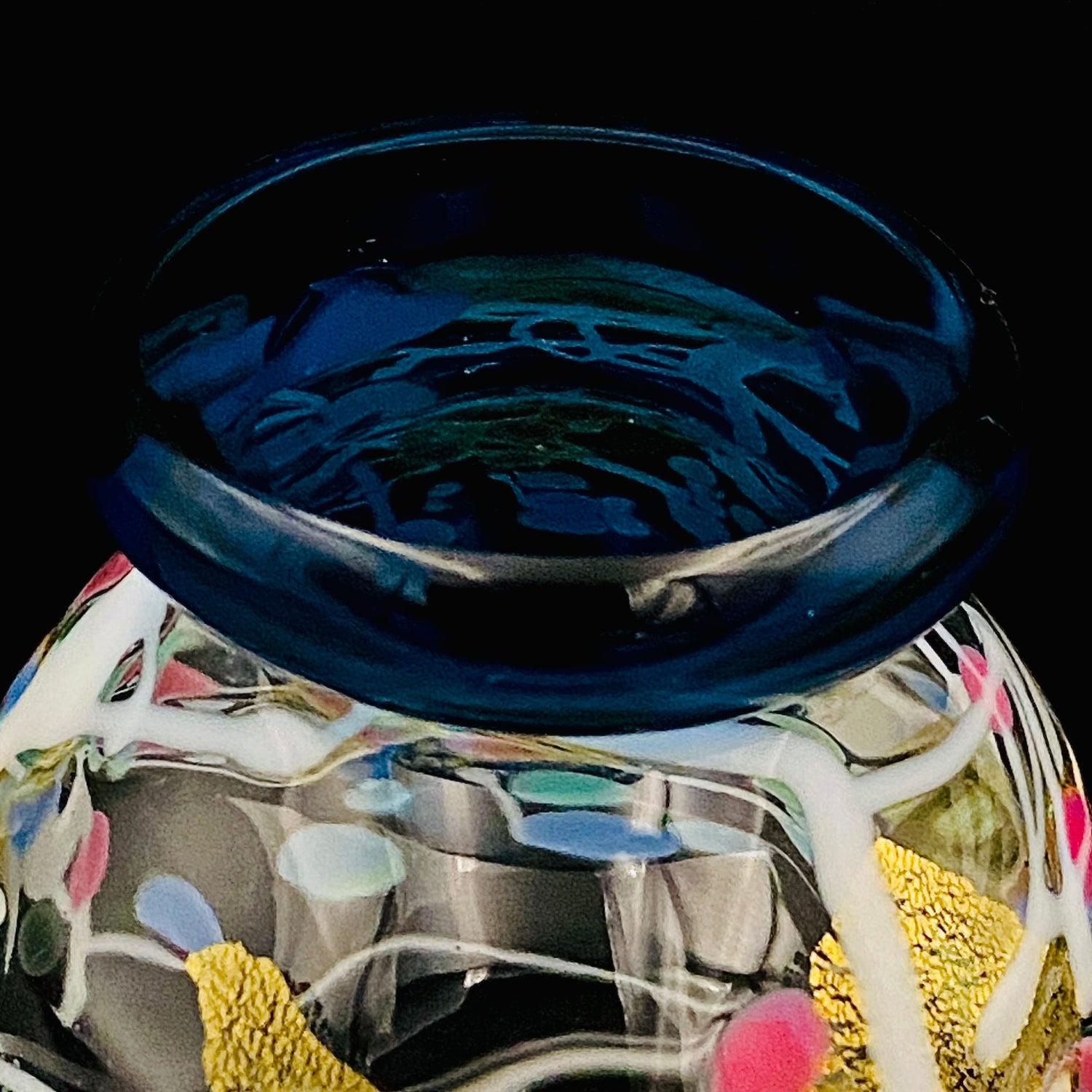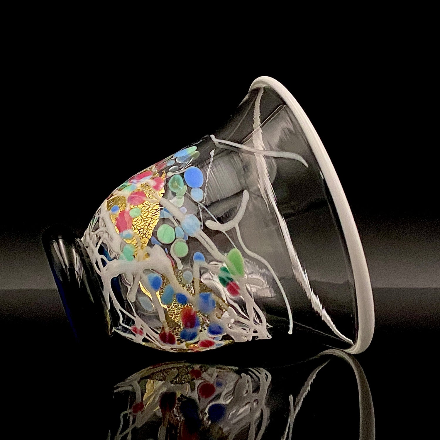 この酒器も、そのクラゲをモチーフにしたものと思われます。グラスの透明な内部には、金箔や多彩な色ガラスの粒が溶け込むように閉じ込められており、水中に漂うクラゲの触手や、体内にきらめく光のような幻想的なきらめきを表現しています。白く細いガラスの線は、クラゲの優雅な動きや、深海の暗闇の中に浮かび上がる生命の軌跡を描き出し、光の反射によって深みと浮遊感を一層際立たせています。
