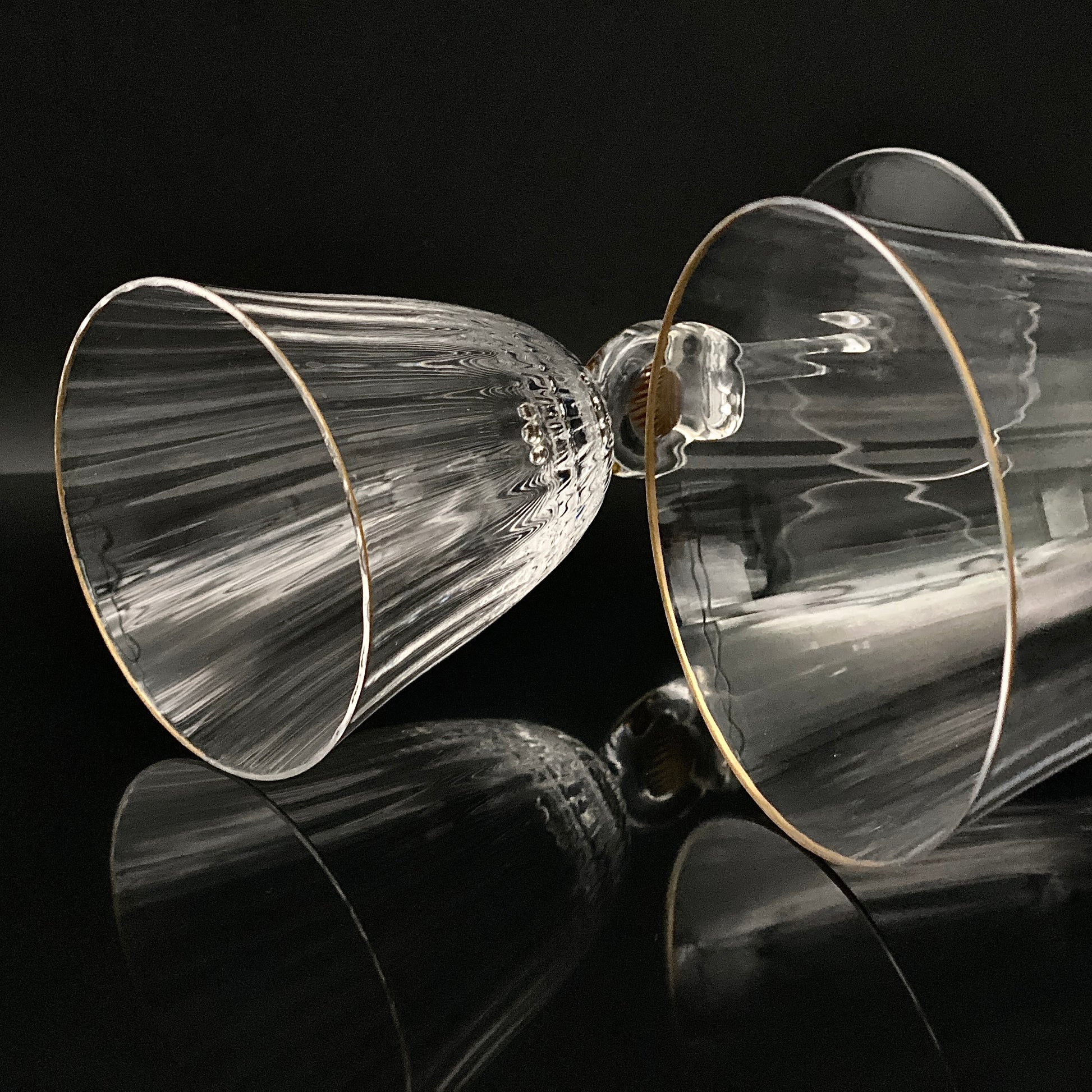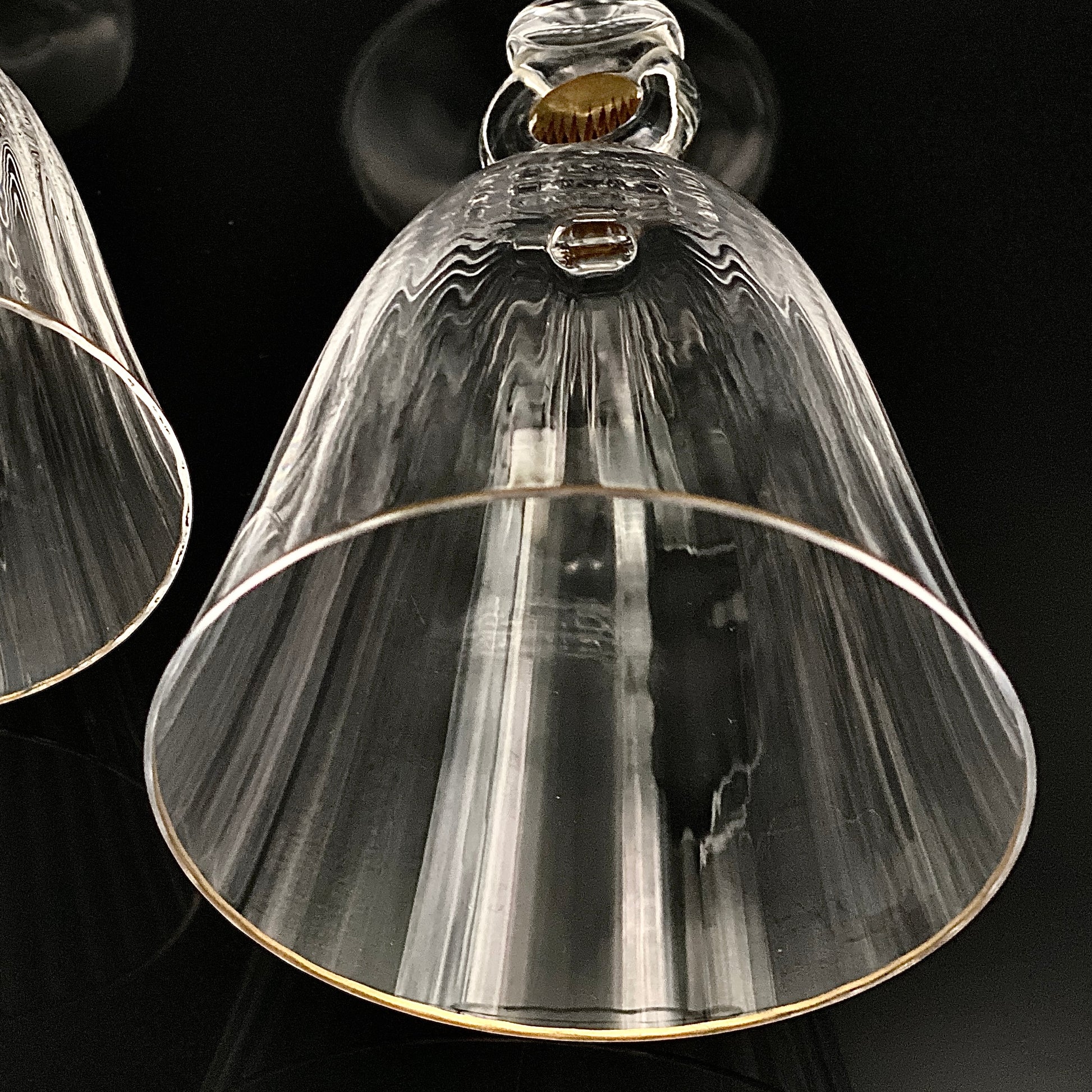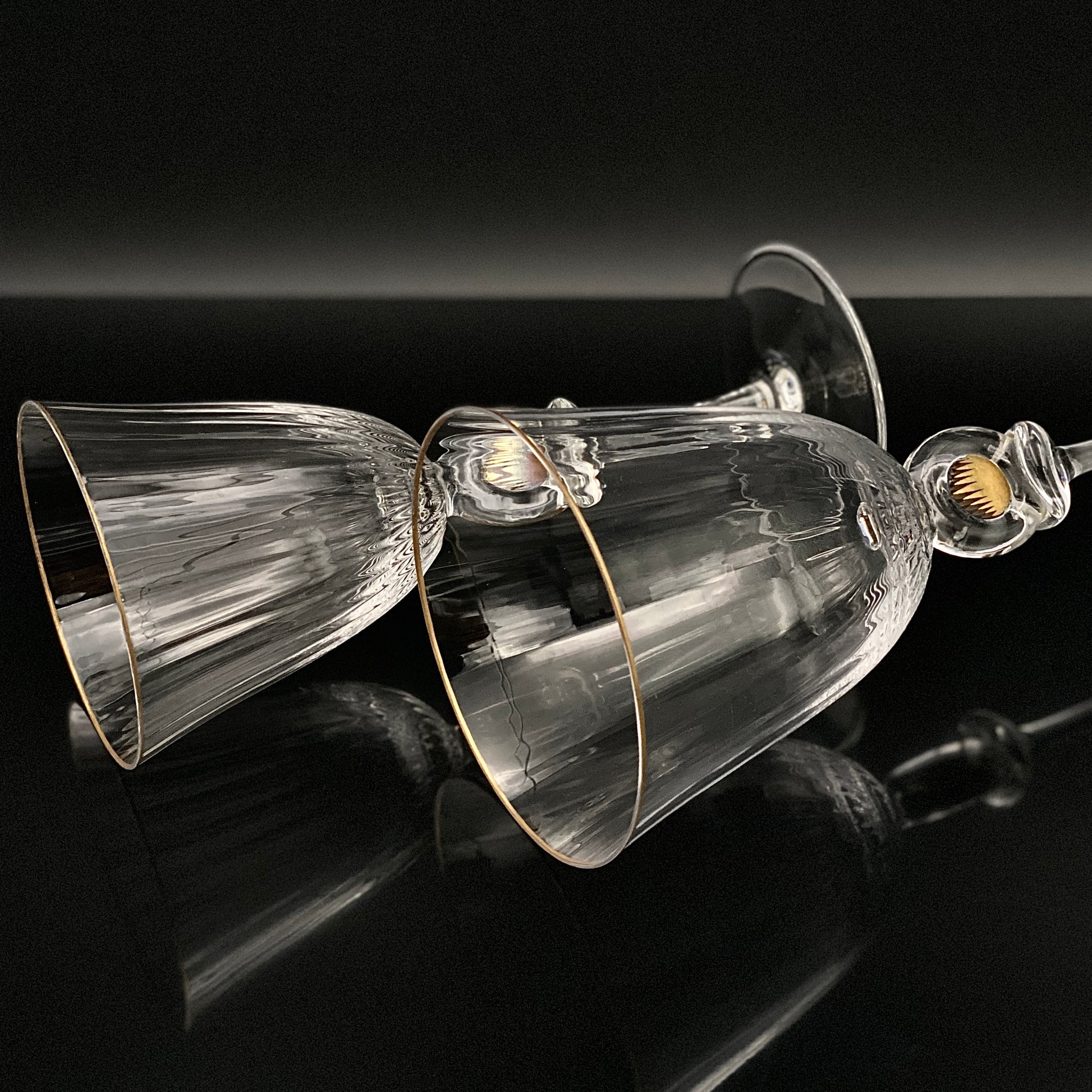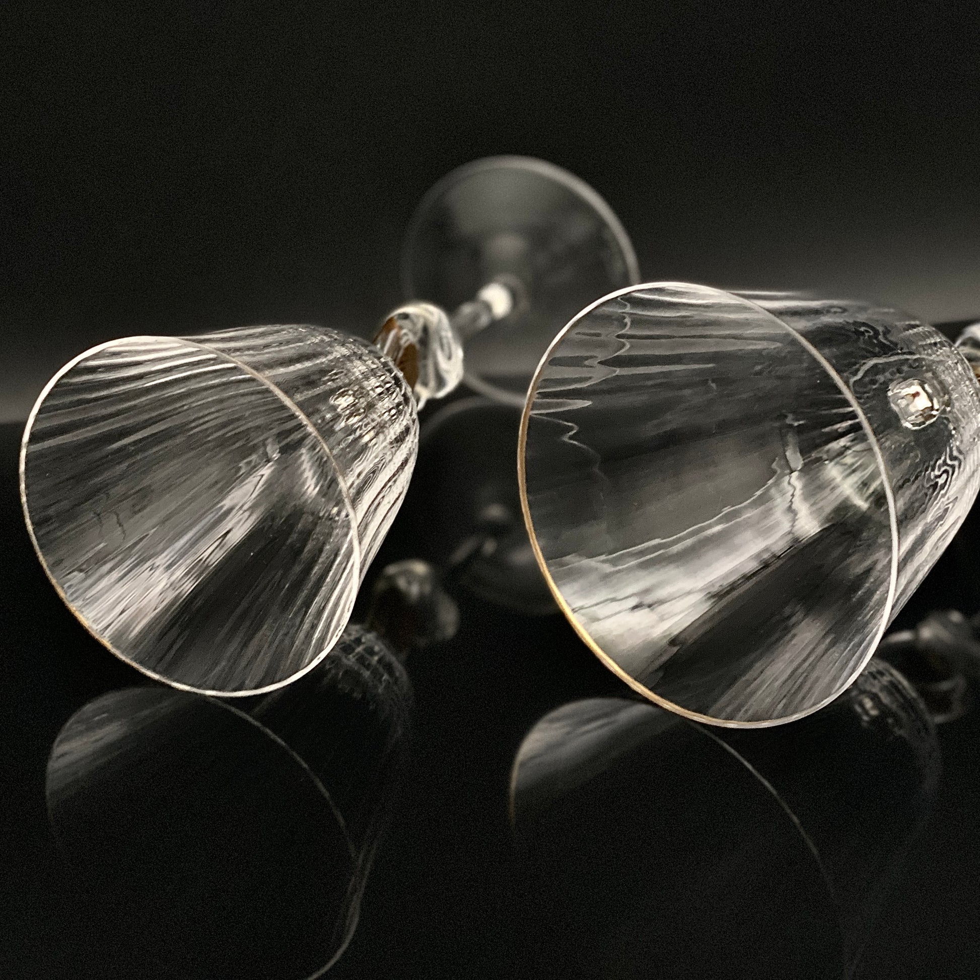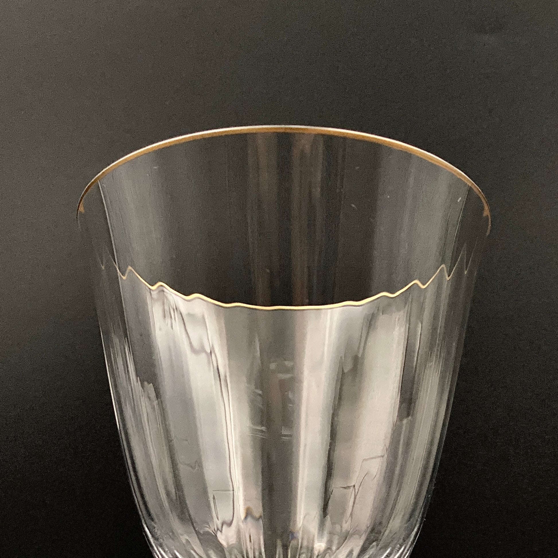 ボウル(グラスの本体部分)には、ヴェネツィアの運河を思わせるかのような、流れるような細やかな縦のカットが施されています。この精巧なカットが、光を美しく反射させ、ワインの色合いをより一層引き立てます。さらに、グラスの飲み口の縁には、ゴールドの繊細なラインが丁寧にハンドペイントされており、グラス全体にエレガントで華やかな印象を与えています。