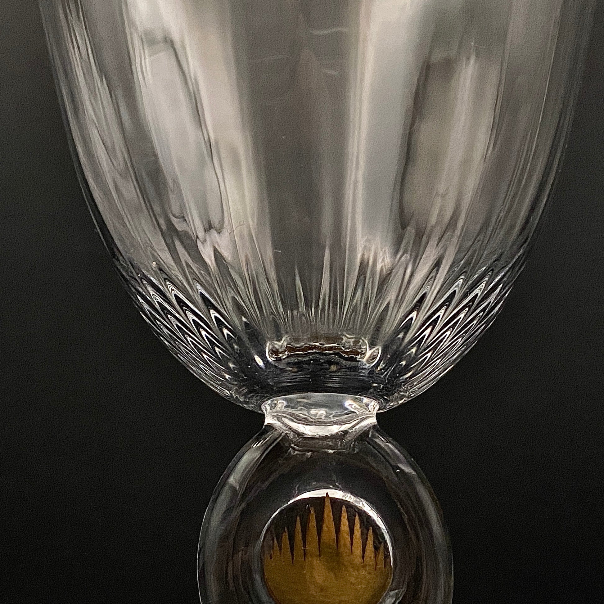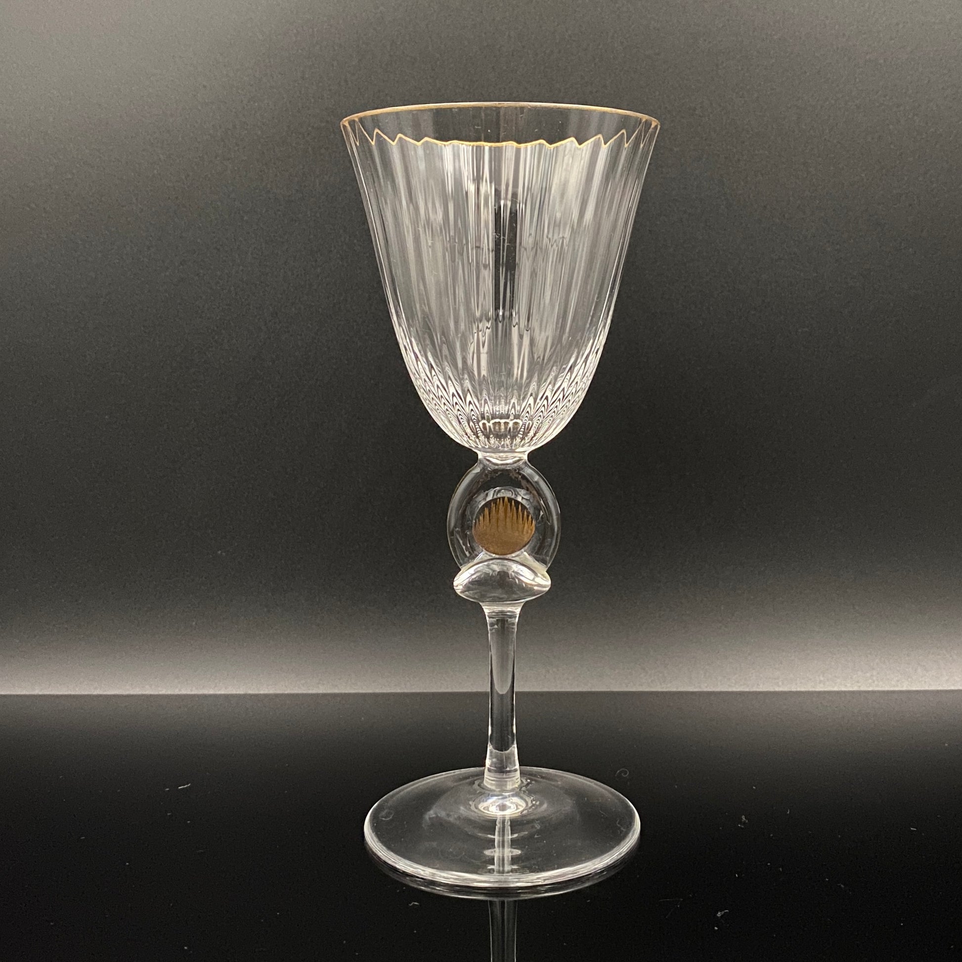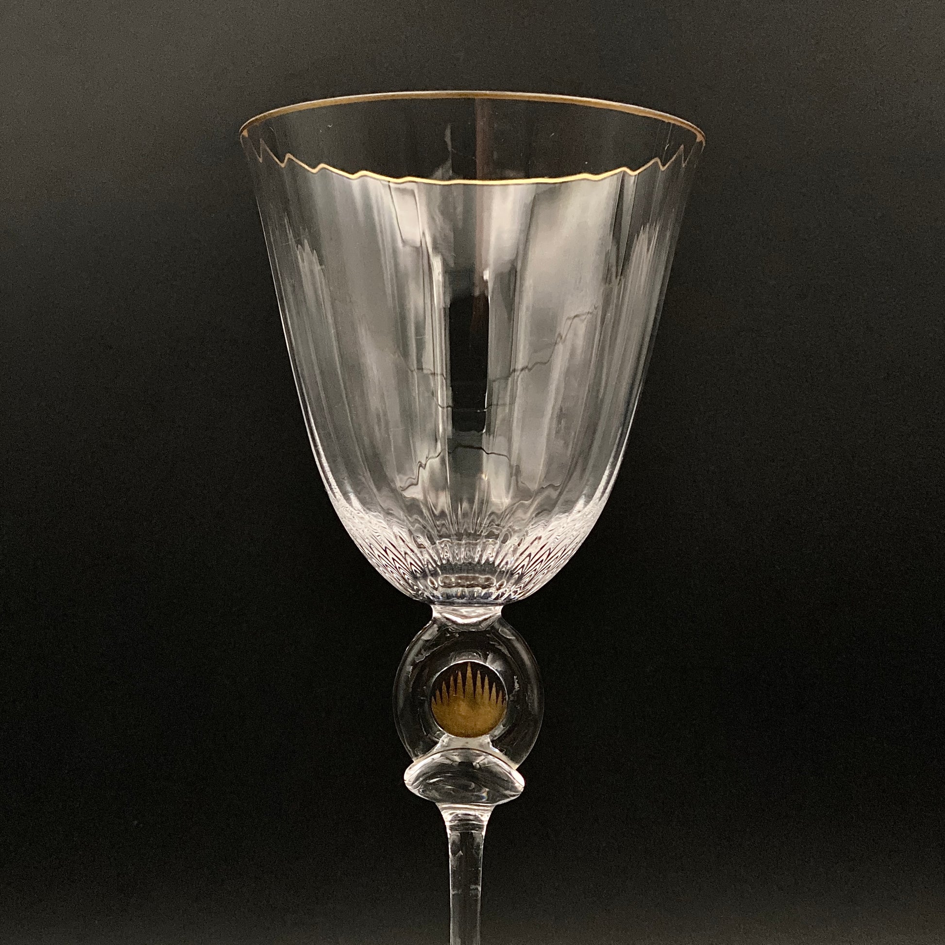 本商品の一番の特徴は、ステム(脚)の中間に配された、金色のアクセントです。この球体のパーツが、グラス全体に温かみと個性的な魅力を与えています。光を受けると、まるでグラスの中に太陽が閉じ込められているかのような、神秘的な煌めきを放ちます。
