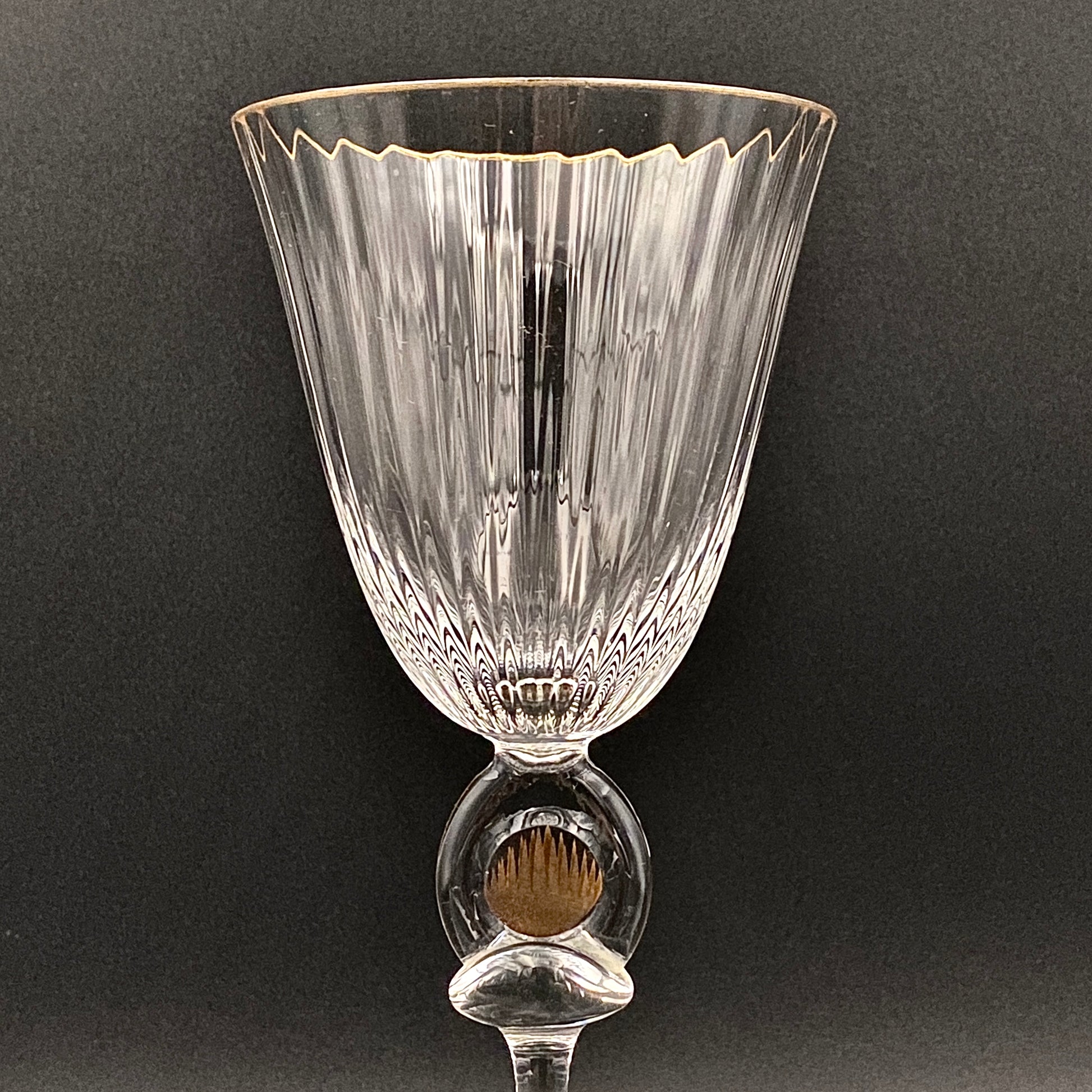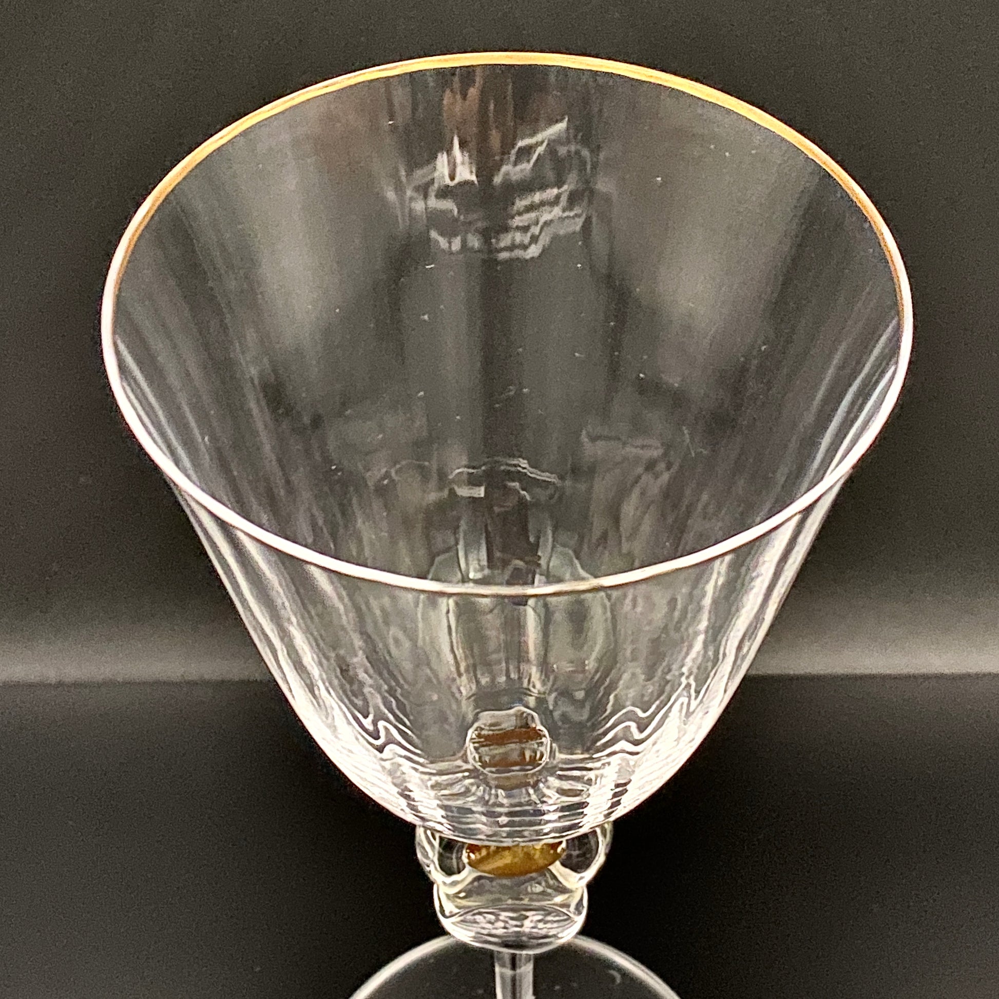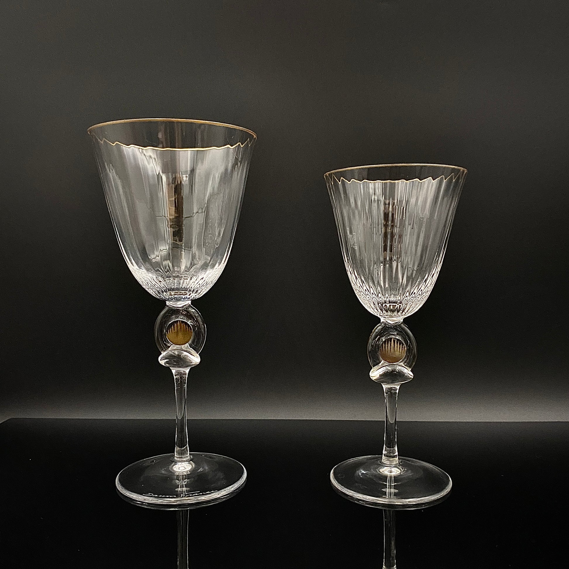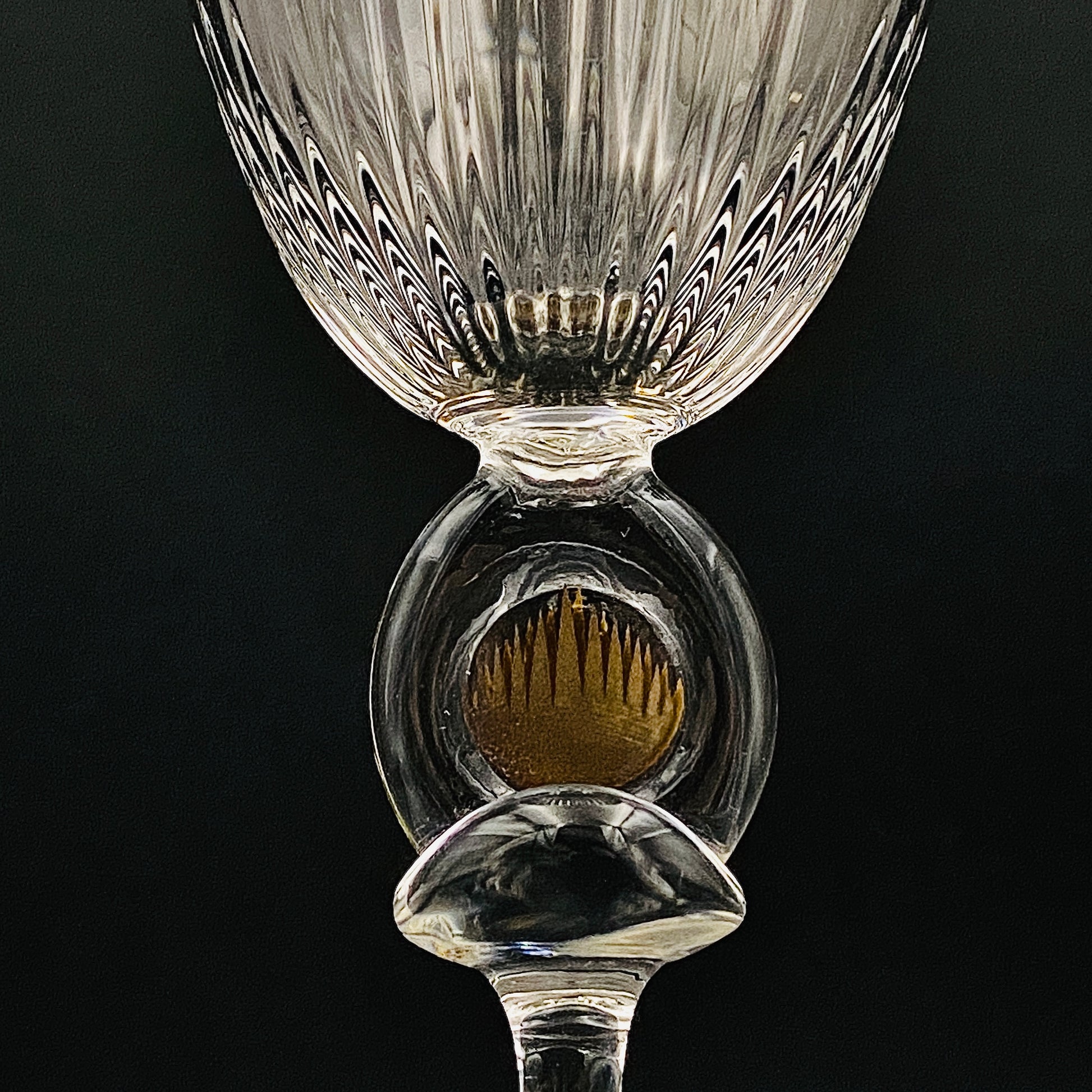 本商品の一番の特徴は、ステム(脚)の中間に配された、金色のアクセントです。この球体のパーツが、グラス全体に温かみと個性的な魅力を与えています。光を受けると、まるでグラスの中に太陽が閉じ込められているかのような、神秘的な煌めきを放ちます。