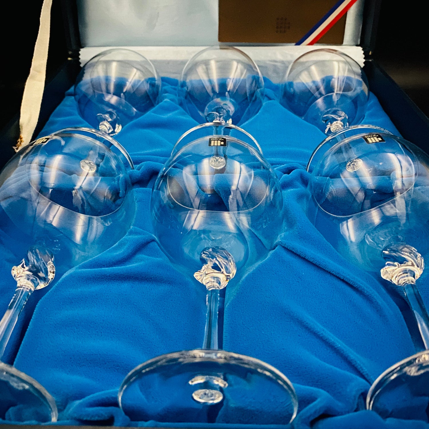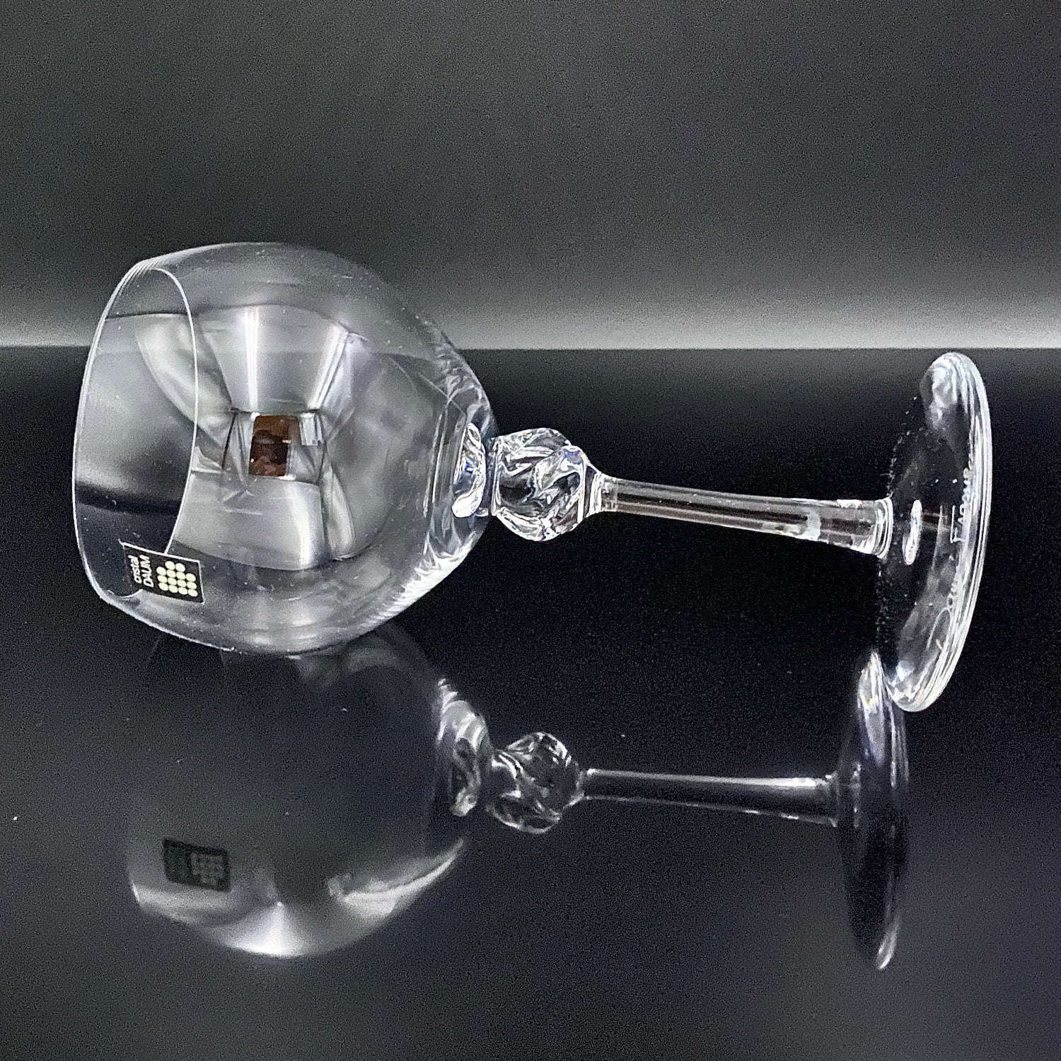 本商品は、ドームクリスタルのBolero(ボレロ)モデルの『ブルゴーニュ型ワイングラス』と推定できます。ボレロは18世紀末に始まったスペイン起源の音楽をイメージしたデザインとの事で、グラスのデザインもシンプルかつ非常にエレガントな佇まいです。ステムのねじれた玉飾りが特徴的な、1970年代の「ボレロ」モデルです。丸くふくよかなボウル形状が、ブルゴーニュワインや繊細な香りを集め、アロマを最大限に引き出します。この優美なグラスで、特別なワインの香りを堪能してください。