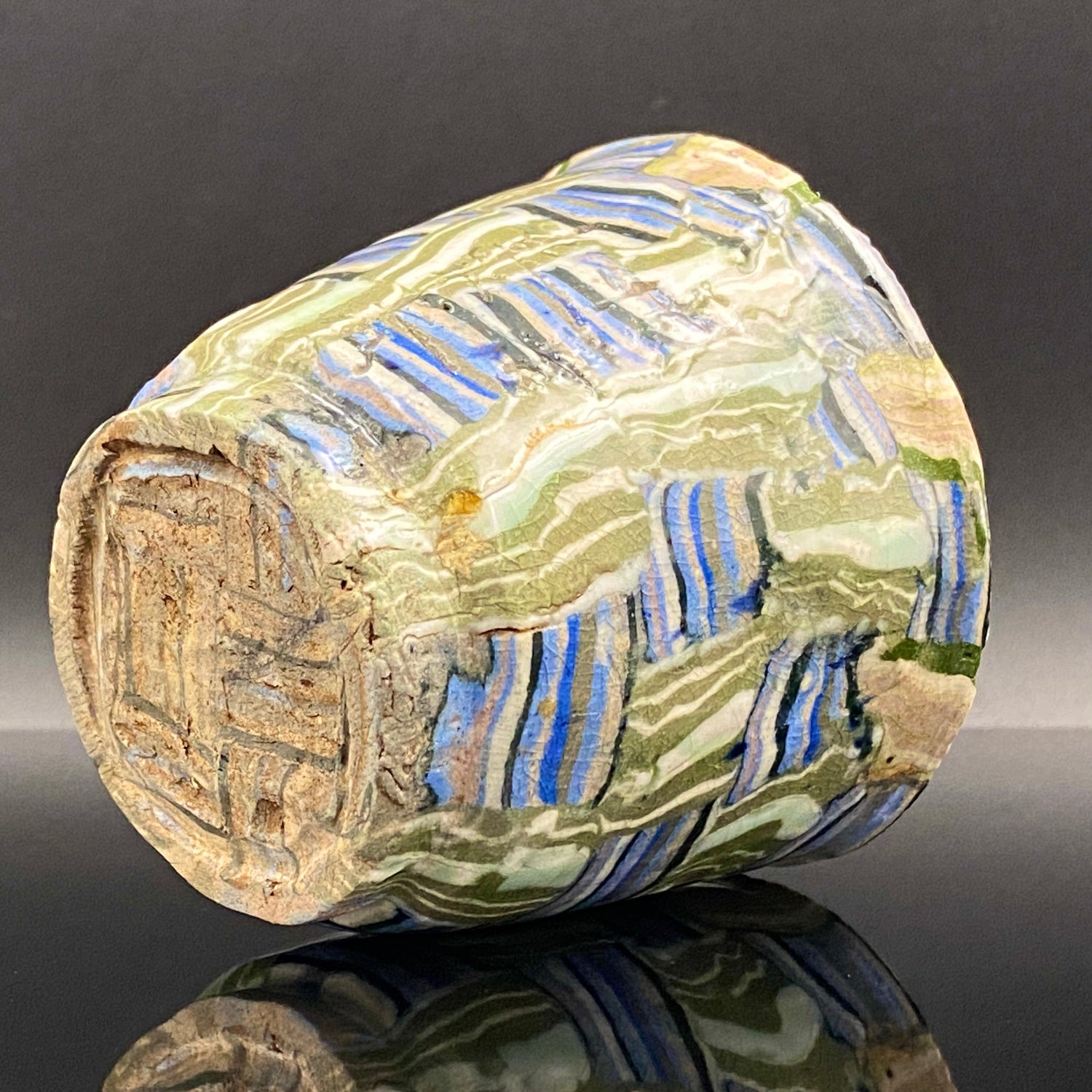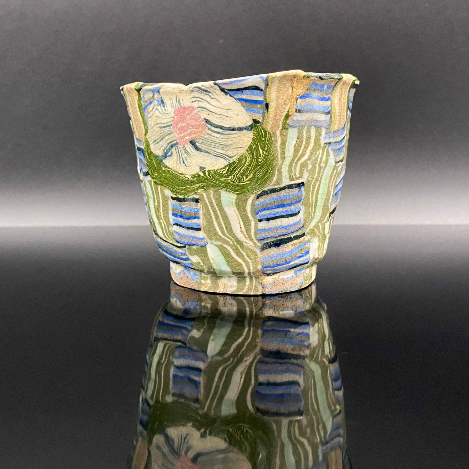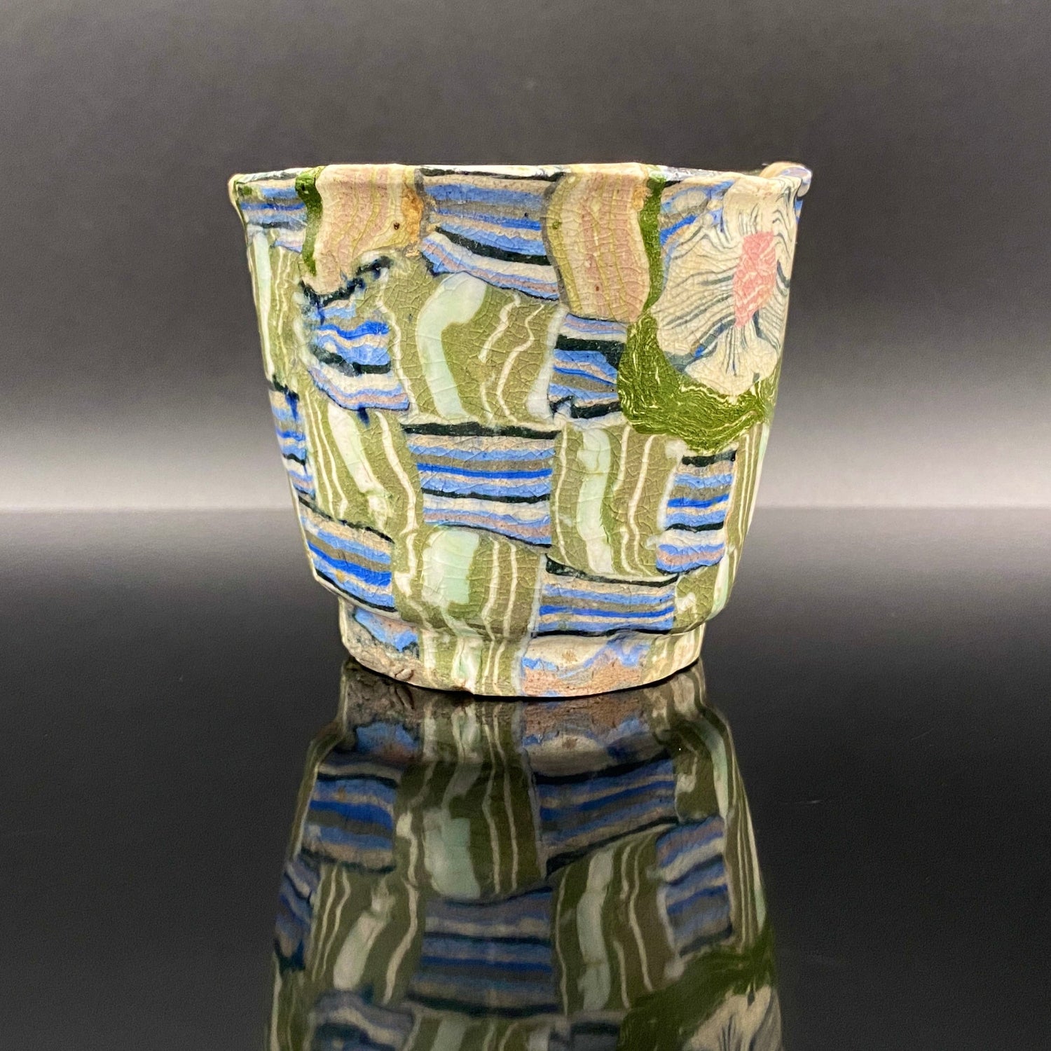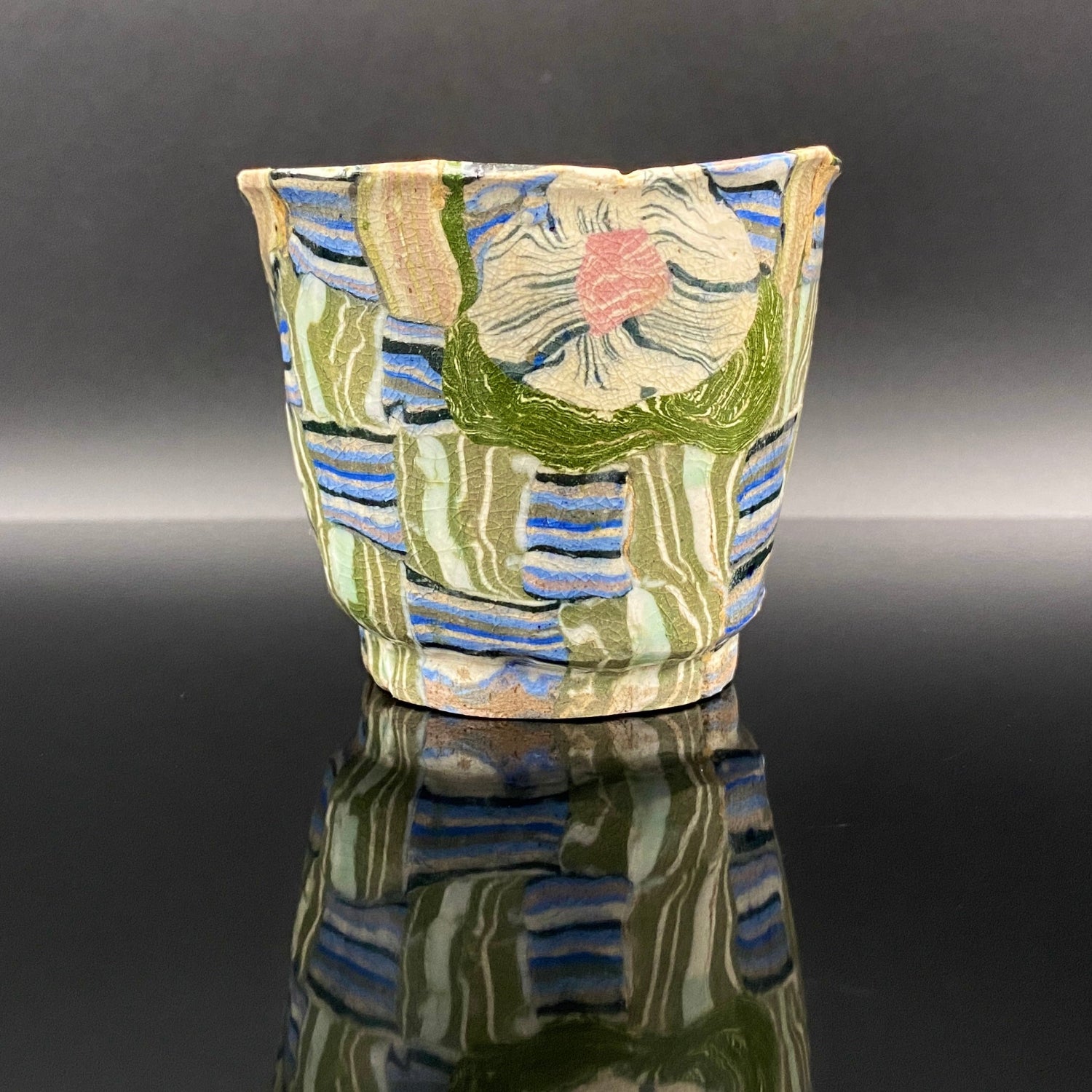 乍看之下,其精美的图案或许会被误认为是笔触勾勒的绘画。然而,这部作品真正的惊人之处在于,其所有的色彩与纹样完全没有使用任何颜料进行表面绘付。这是通过已失传的幻之技法——“表里贯通锦练上手(绞胎)”制作而成。将混合了不同金属氧化物而着色的粘土,基于精密的计算像复杂的拼图一样组合,使图案本身成为了陶土的结构。
