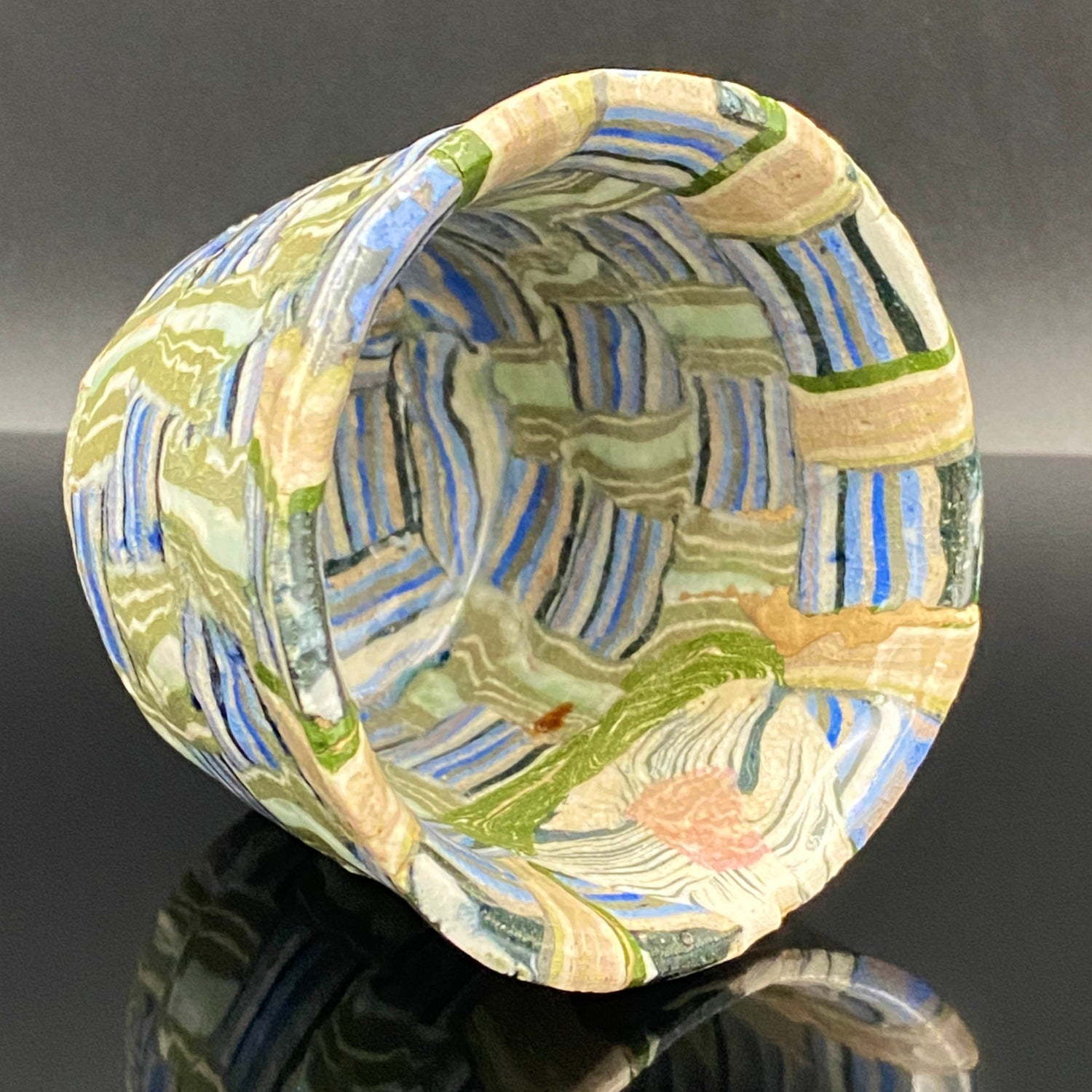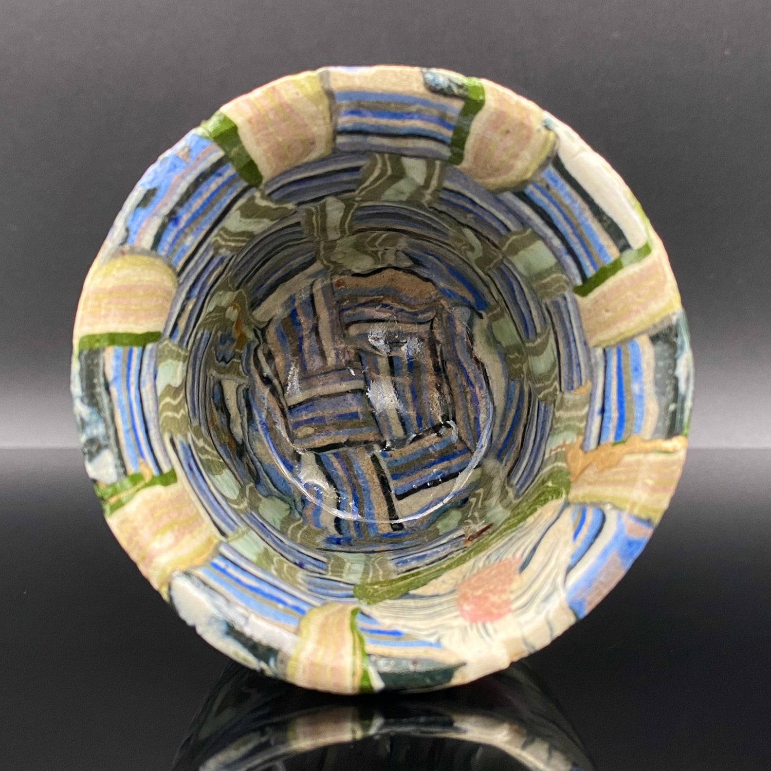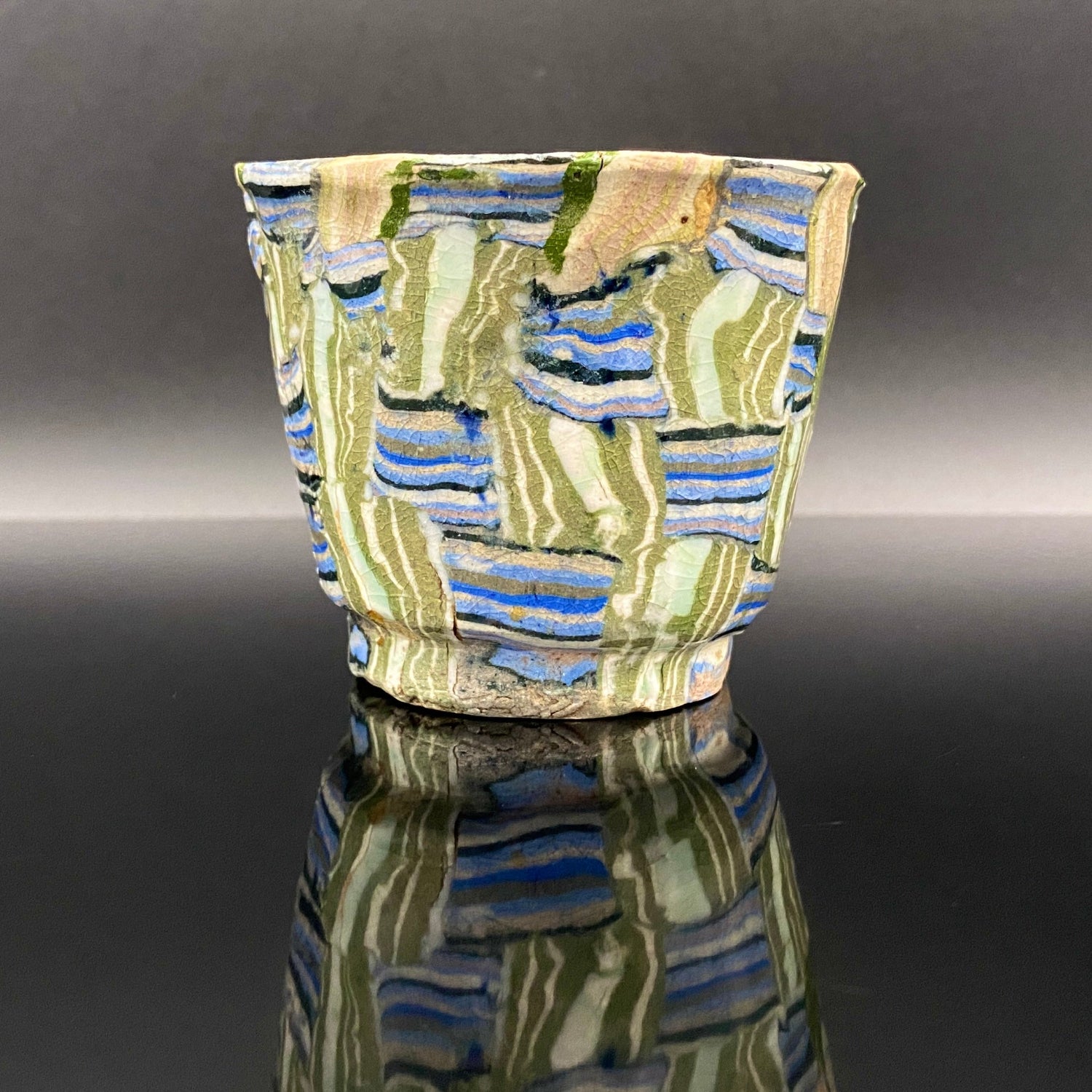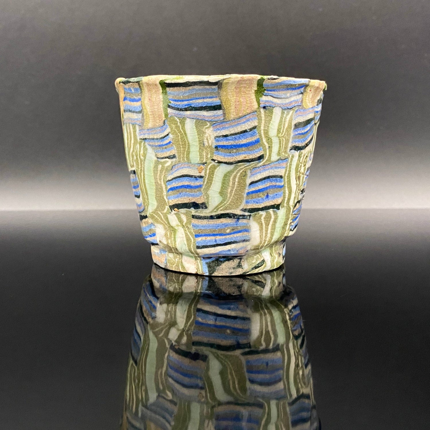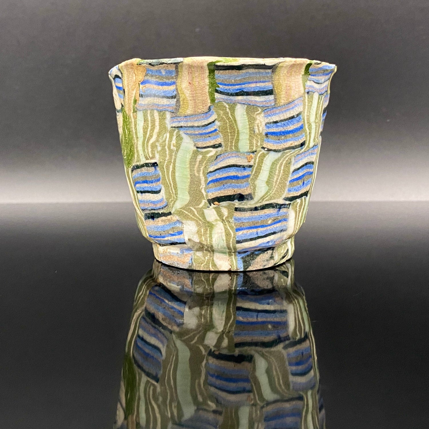 乍看之下,其精美的图案或许会被误认为是笔触勾勒的绘画。然而,这部作品真正的惊人之处在于,其所有的色彩与纹样完全没有使用任何颜料进行表面绘付。这是通过已失传的幻之技法——“表里贯通锦练上手(绞胎)”制作而成。将混合了不同金属氧化物而着色的粘土,基于精密的计算像复杂的拼图一样组合,使图案本身成为了陶土的结构。