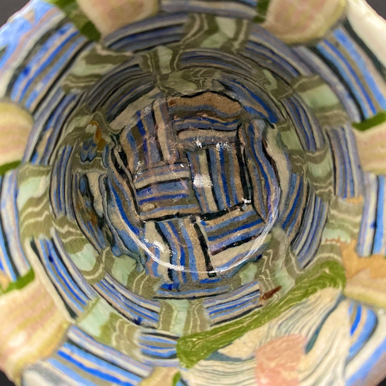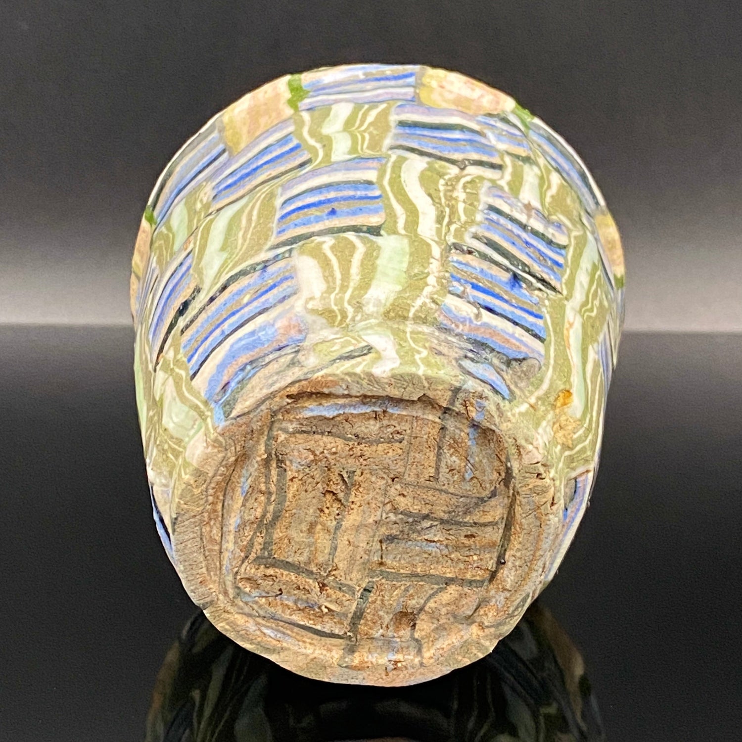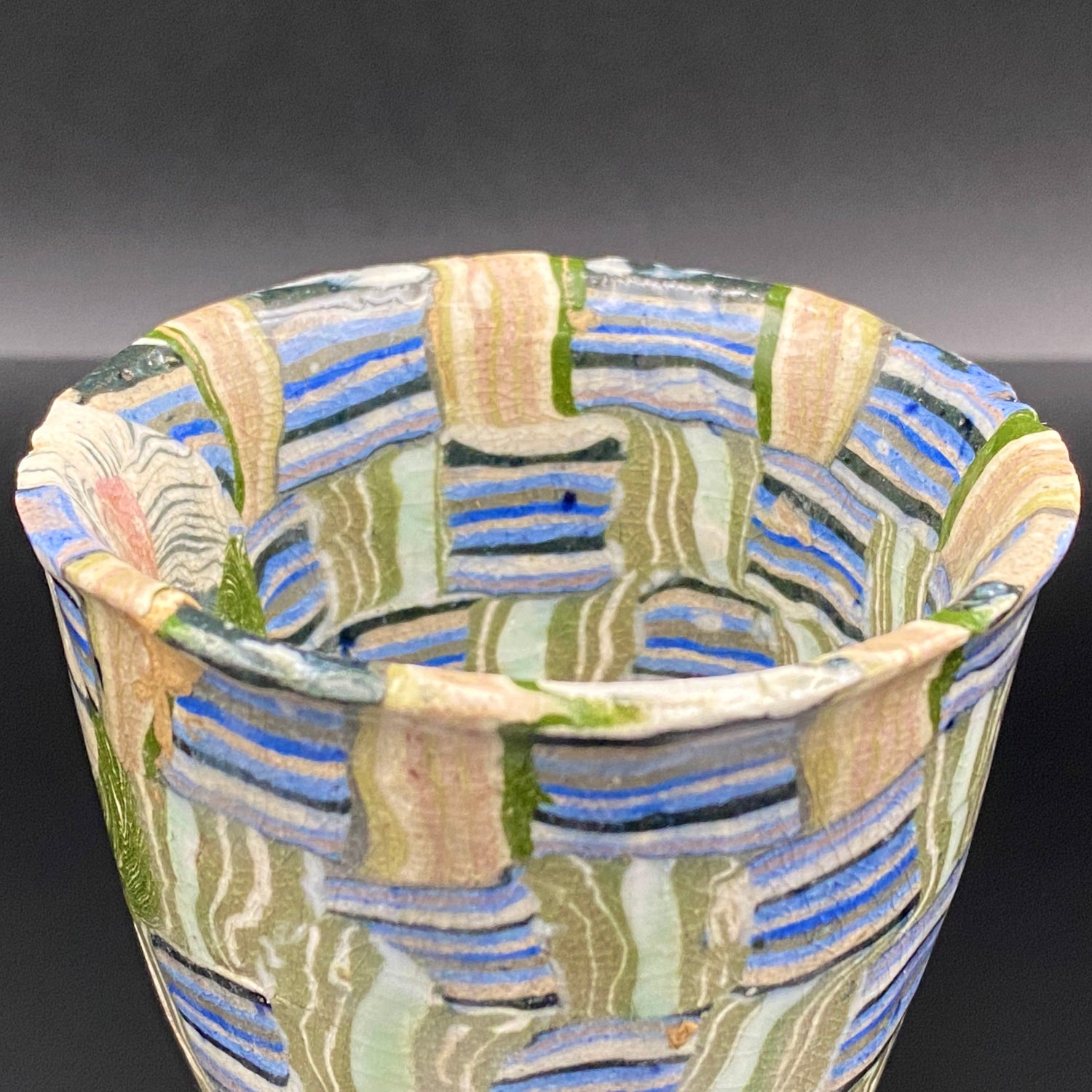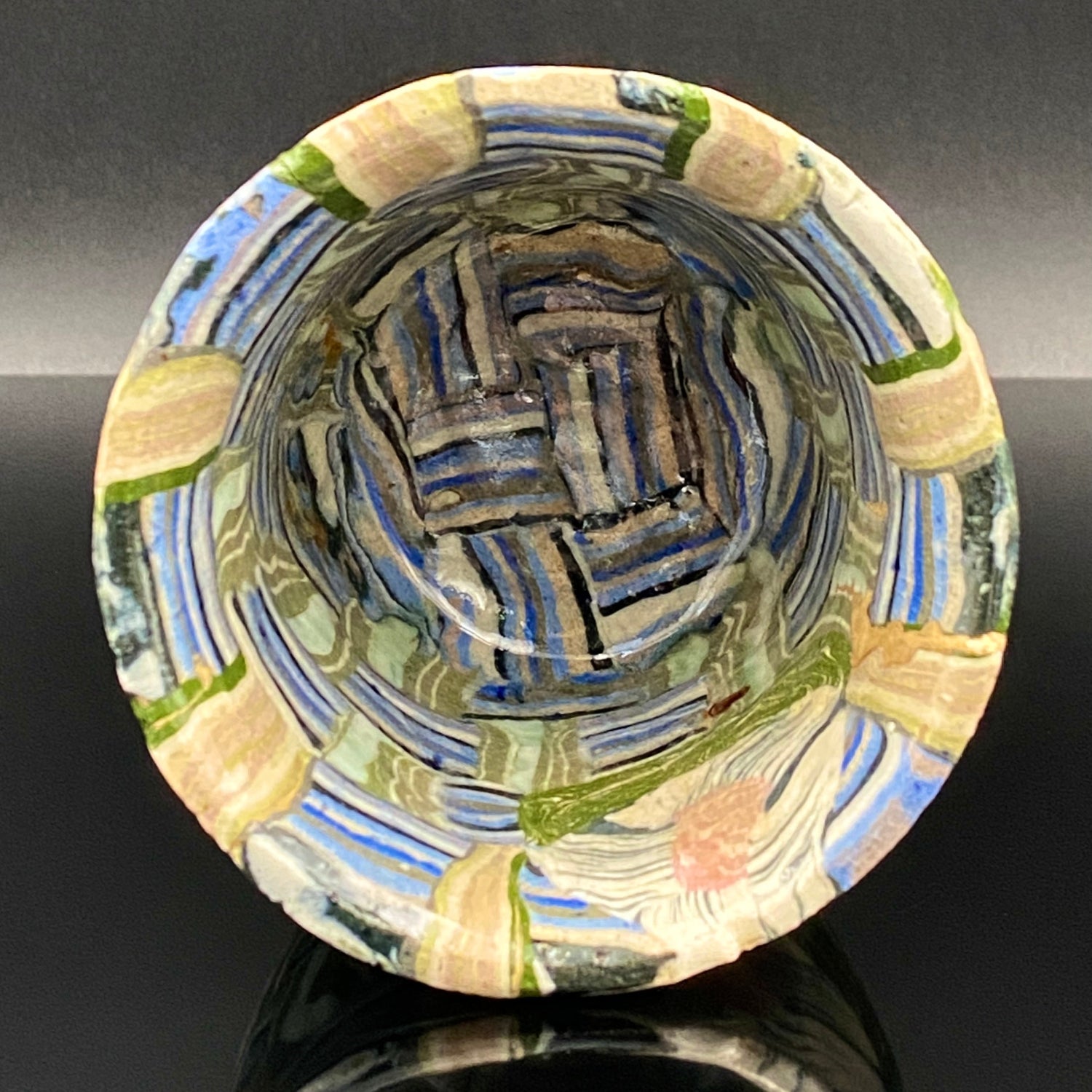 乍看之下,其精美的图案或许会被误认为是笔触勾勒的绘画。然而,这部作品真正的惊人之处在于,其所有的色彩与纹样完全没有使用任何颜料进行表面绘付。这是通过已失传的幻之技法——“表里贯通锦练上手(绞胎)”制作而成。将混合了不同金属氧化物而着色的粘土,基于精密的计算像复杂的拼图一样组合,使图案本身成为了陶土的结构。