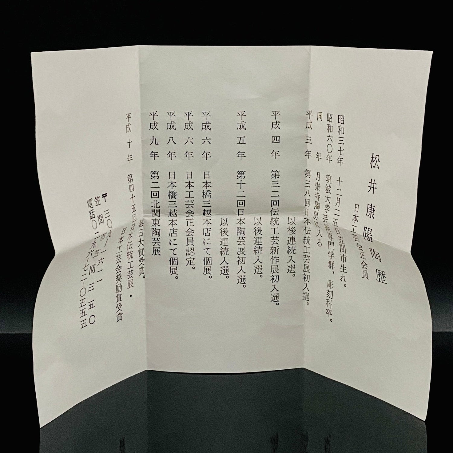- 作者代表性活动历:[1985年] 筑波大学艺术专门学群毕业后,师从其父松井康成(人间国宝),[1991年] 获得第38届日本传统工艺展鼓励奖,[2002年] 获得日本陶瓷协会奖,[2005年] 获得第33届传统工艺新作展鼓励奖,[后年] 历任日本工艺会正会员、茨城县陶艺美术馆协议会委员等职