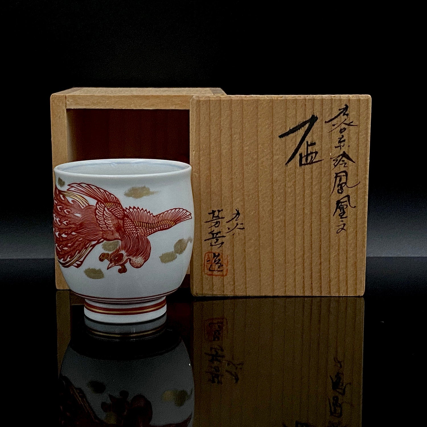 山本芳岳(Yamamoto Hogaku)最上位作 九谷烧 赤绘细描 金彩赤绘 凤凰文 清酒杯 酒器 皇室献礼作家 #193